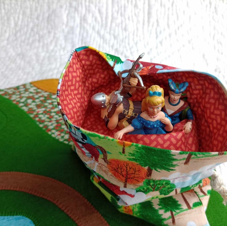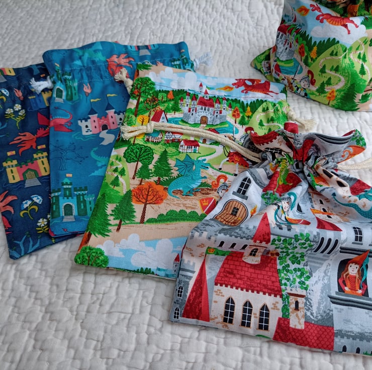 A little drawstring storage bag, with a choice of princess, knight, castle and dragon fabrics - just the right size for keeping small toys safe at home or when out and about, and make great little gift bags that can be reused - very eco friendly.