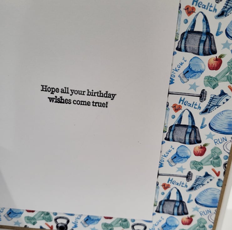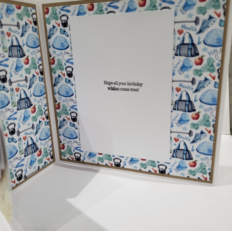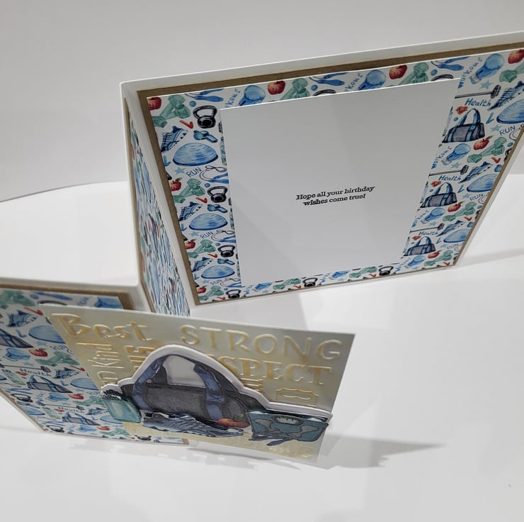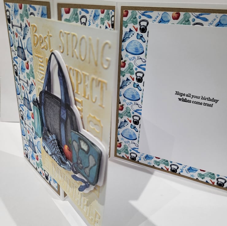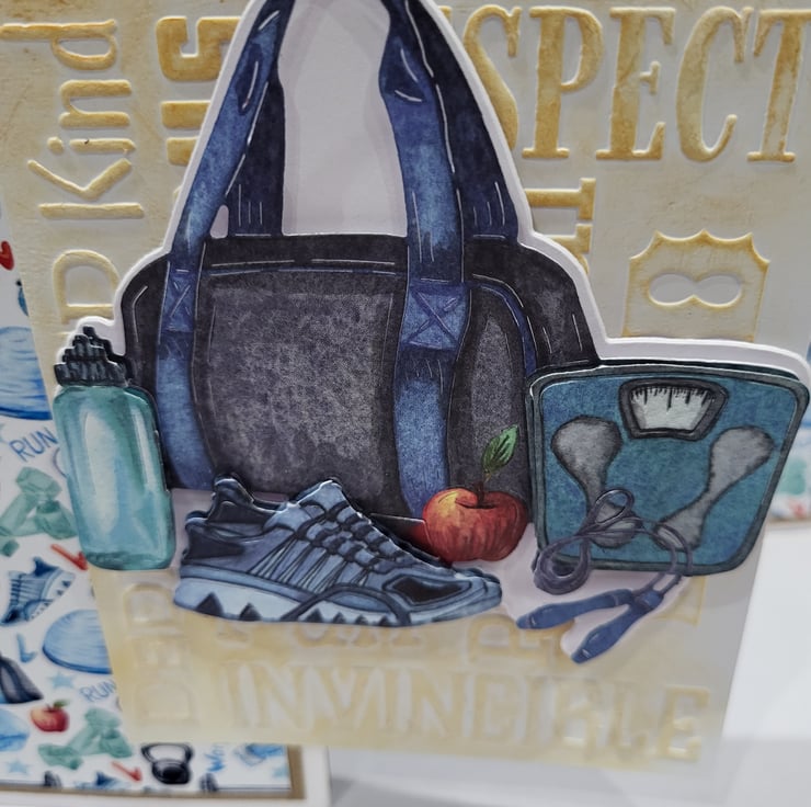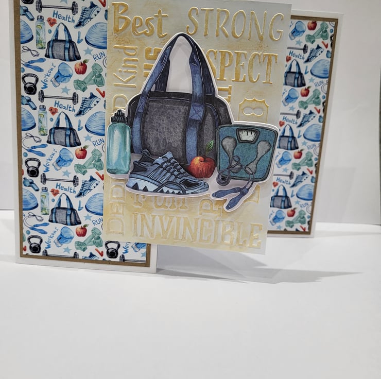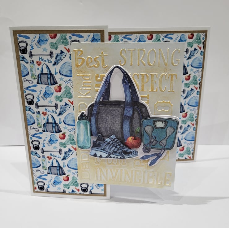 The card is in a z shape fold with an overhanging rectangle which has been embossed with motivational words for anyone who loves working out. I have then added a layered up topper which consists of all things needed for a gym work out.