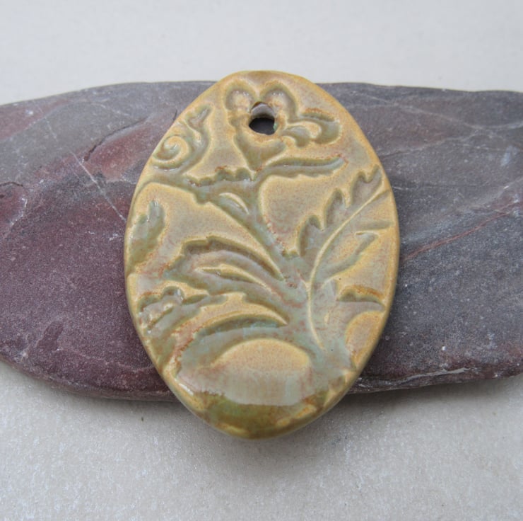 Large stoneware ceramic pendant, patterned with an embossed design of leaves and flowers, and finished with an attractive old gold coloured glaze.