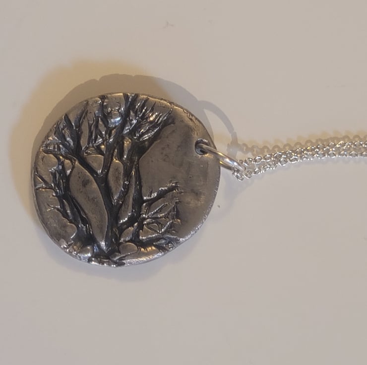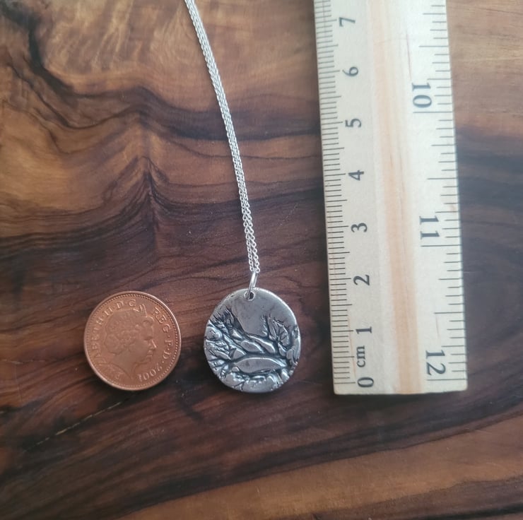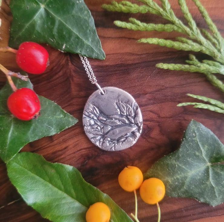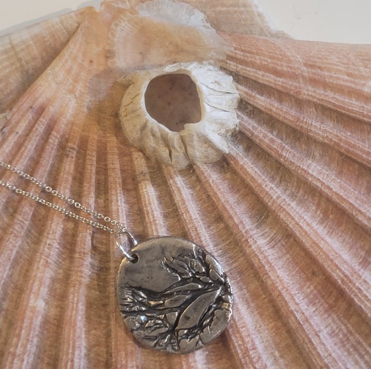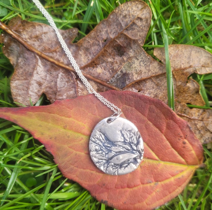 All my pendants are handmade from silver clay, using real leaves, lichen, pine cones, etc (whatever the subject happens to be). I create a mould of the leaf to capture every detail. Silver clay is then pressed into the mould before being dried, sanded, fired and polished.