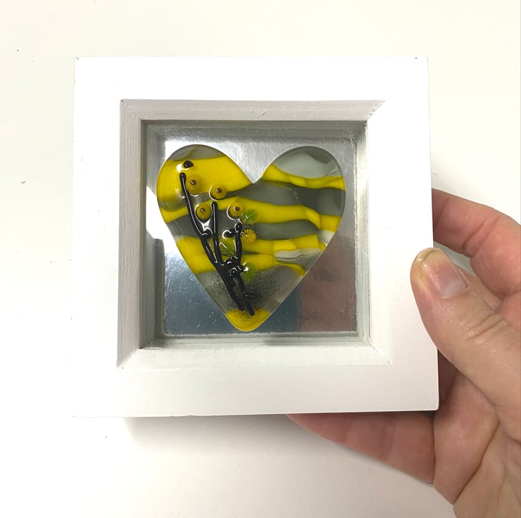 Gorgeous fused glass boxed framed heart to hang on the wall or freestanding. There is nothing wrong with the item - just old stock . The white wood frame is approximately 10cm square and the heart around 3 inches diameter . Shades of yellow and grey are used together with tiny glass murine sunflowers. The backing is mirror effect