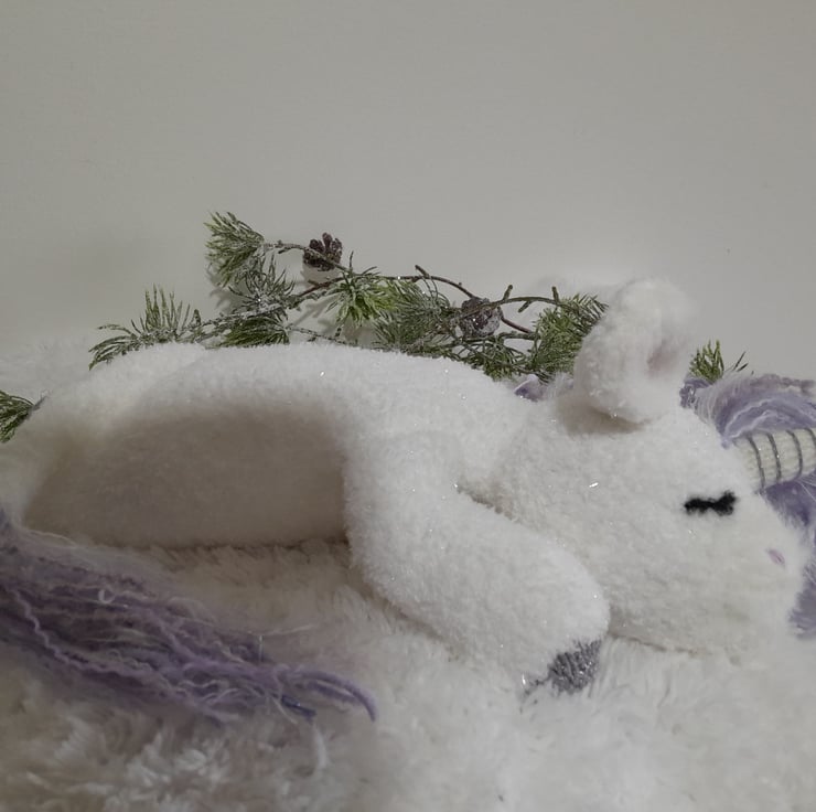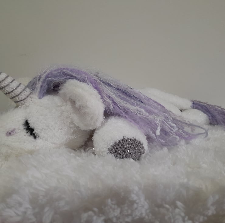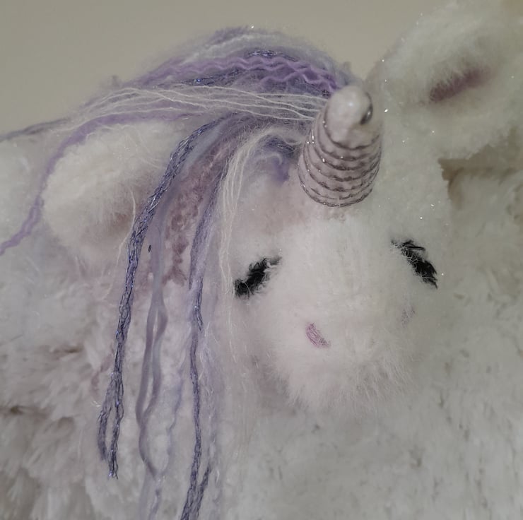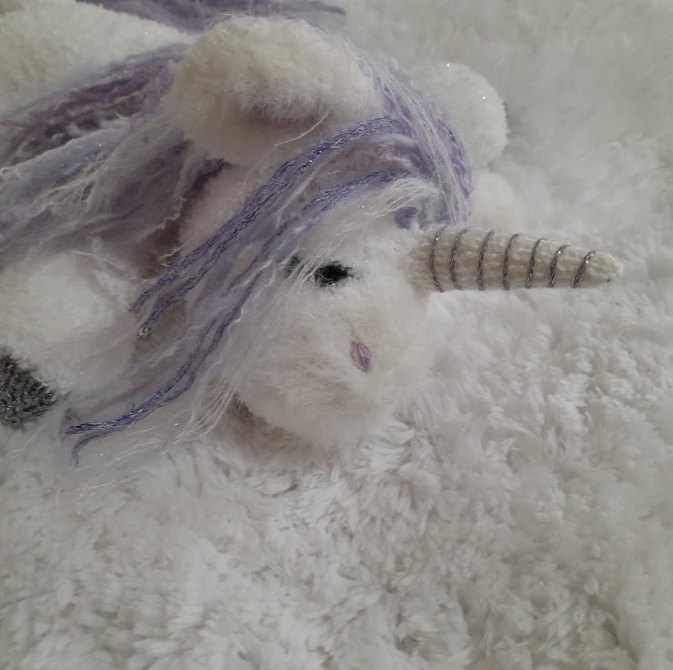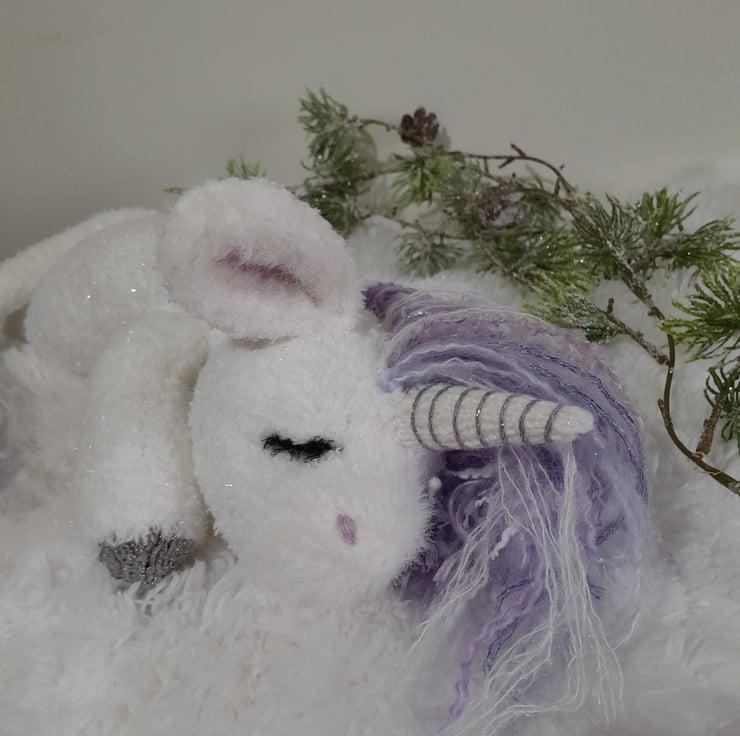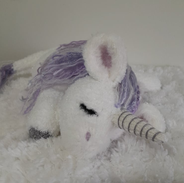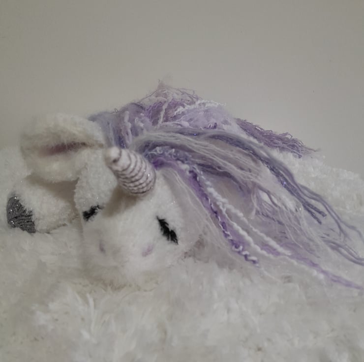 Knitted in a soft white velour yarn with a hint of sparkle. Her mane and tail are shades of soft lilac giving her a ethereal look.
