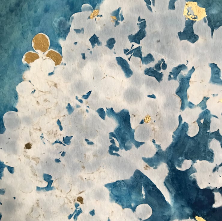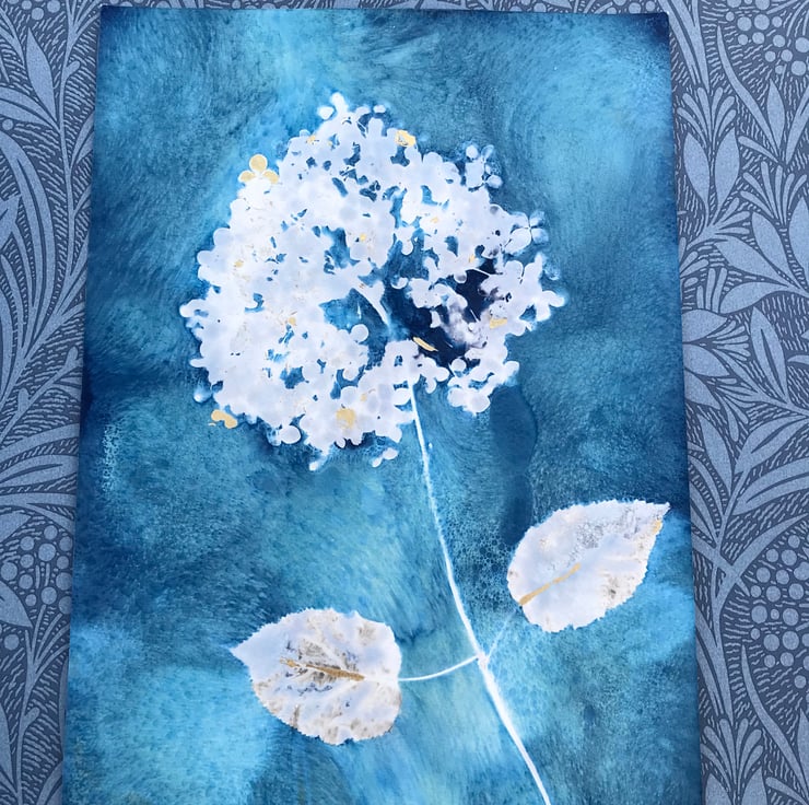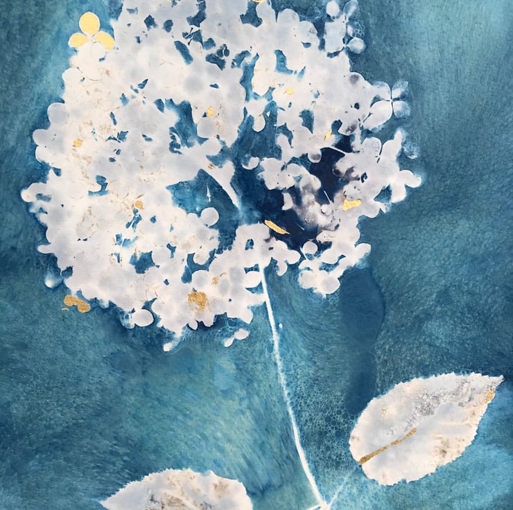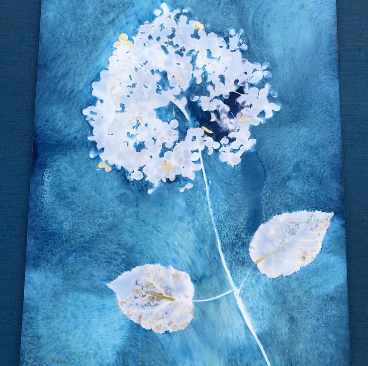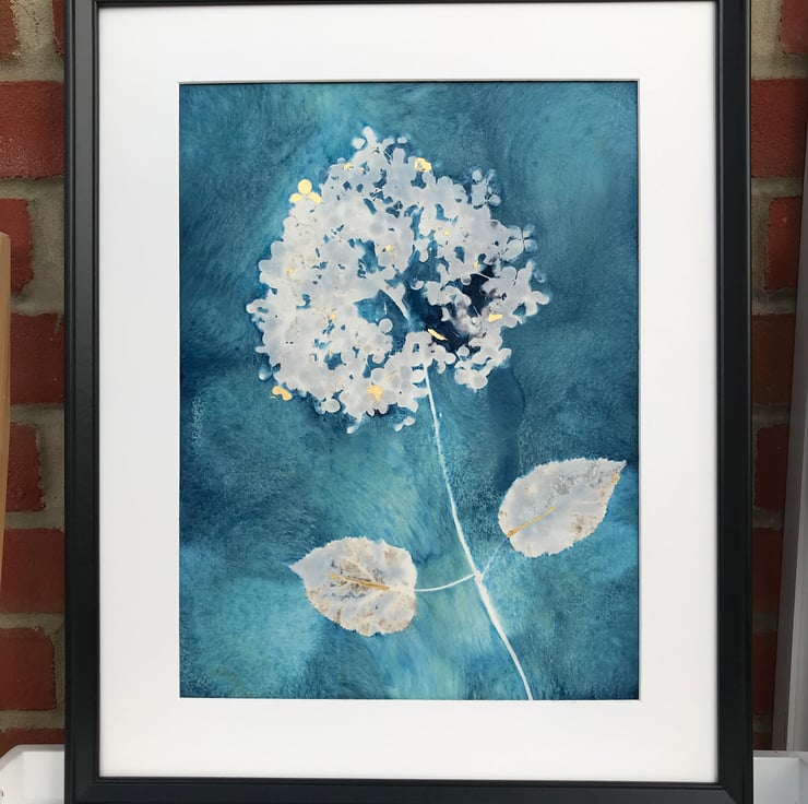 Soft and white like a big powder puff this Cyanotype of Hydrangea Annabelle has been gently embellished with pops of 24ct gold, giving it a decadent look. A great big puff ball of lovlines sitting on a wash of blues, just waiting for a frame of your choice.