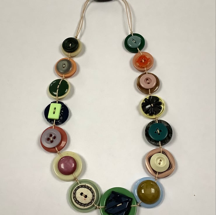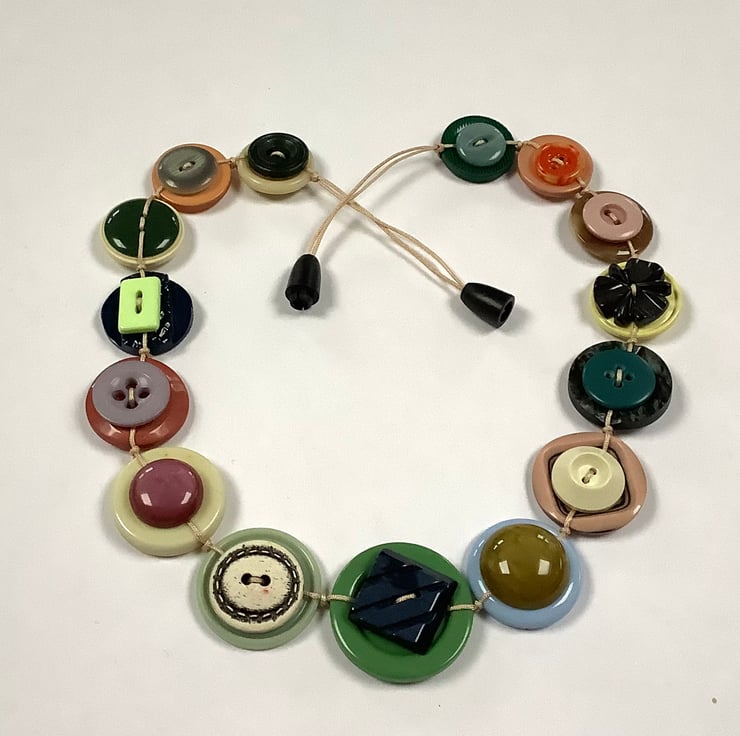 A button necklace made up of old and new buttons and threaded with strong polyester thread. The middle button measures 3cm and the overall necklace length is 53cm, and ends with an easy to use snap catch.