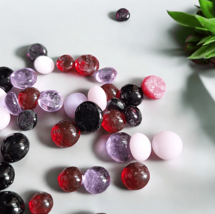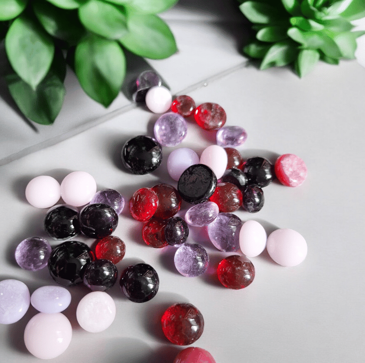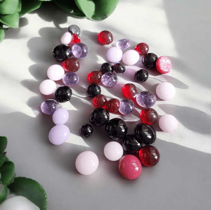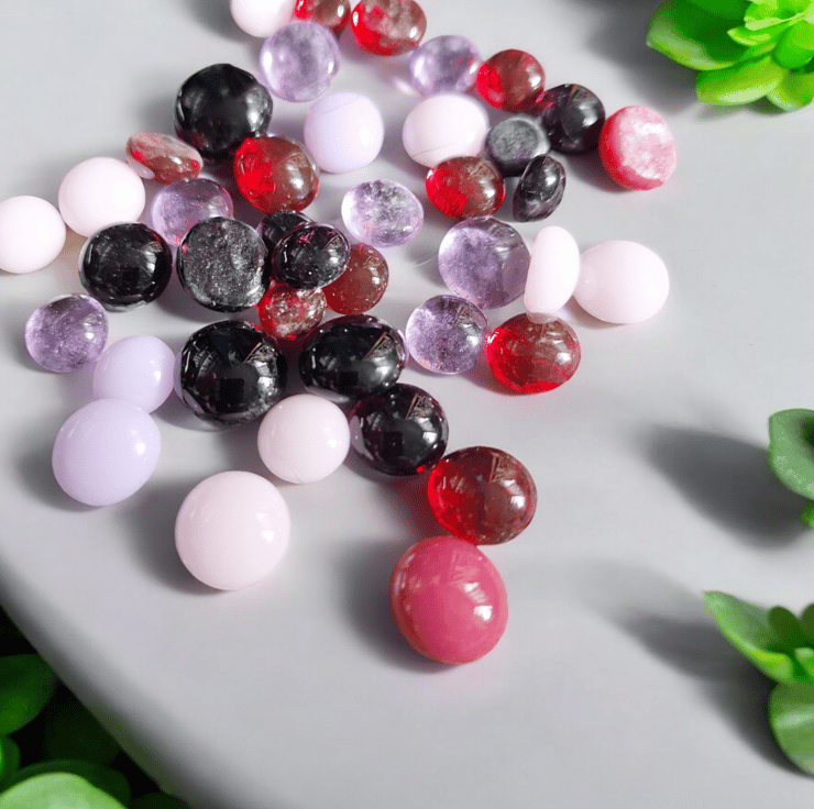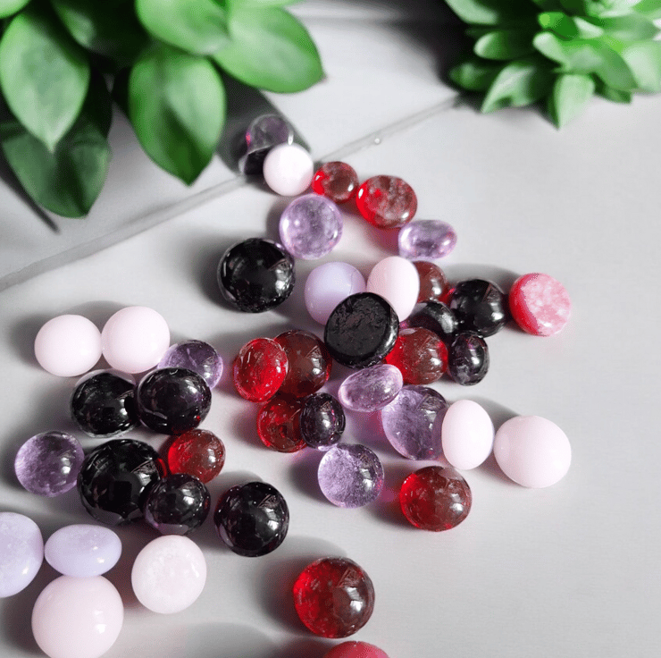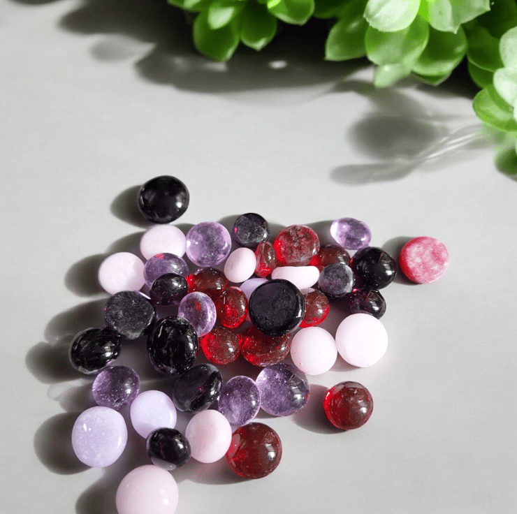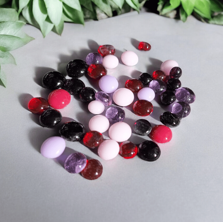 Each batch is random, offering a surprise mix of beautiful hues. There are both transparent and opal beads. These dots and cabochons are an eco-friendly choice, made using leftover kiln-fused glass to minimise waste.