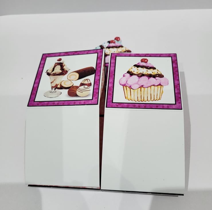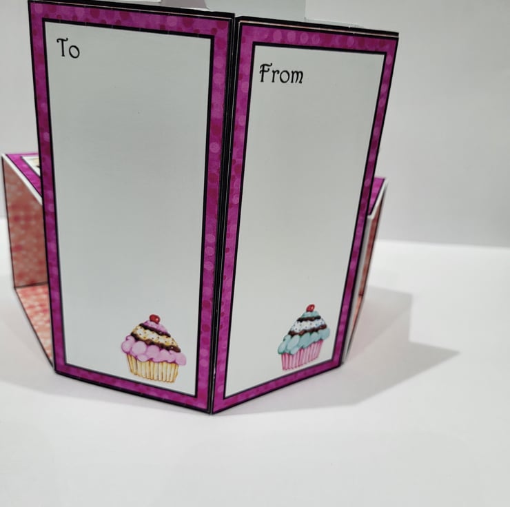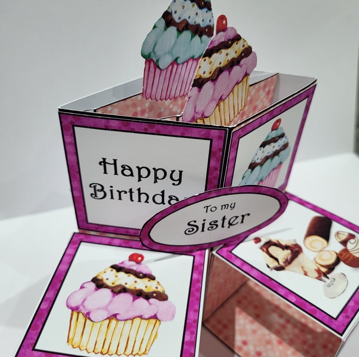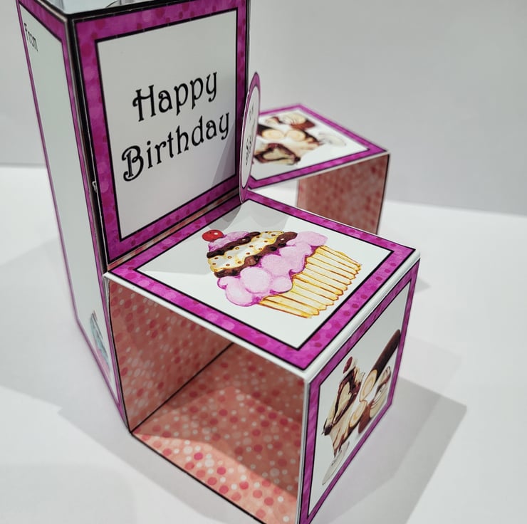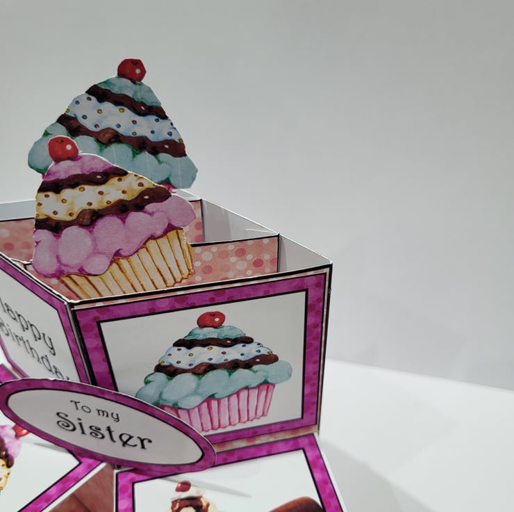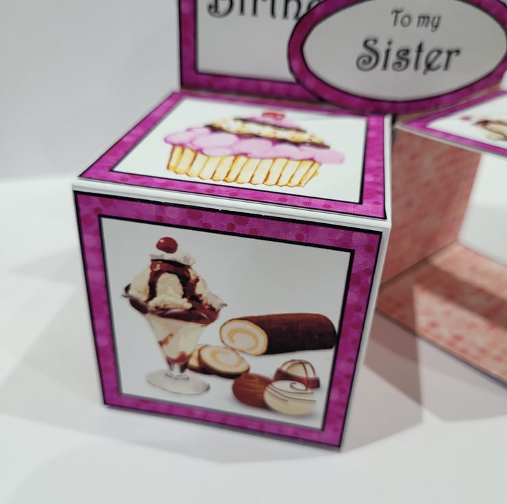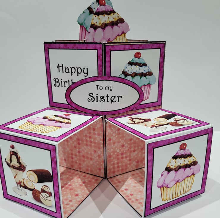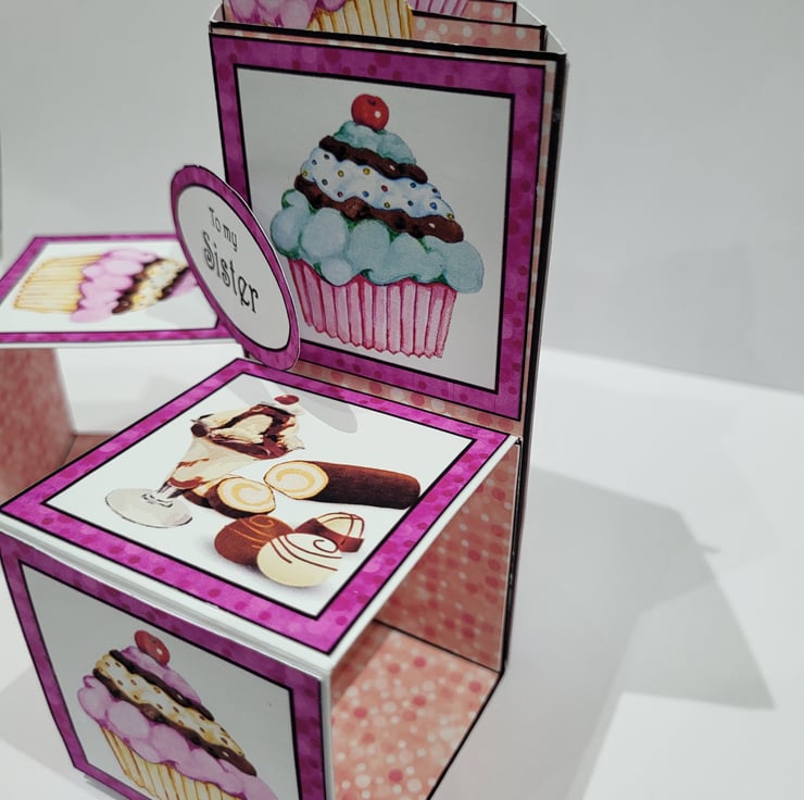This 3d card is fabulous for any baking fan. It is created to have a stacked cube effect. It then will fold flat by the small two cubes folding upwards and the large rectangle folds flat so it easily fits into an envelope. There is room on the back for you to add your message to the recipient. The sentiment can be changed and the card could be for sister mum etc etc. Please message me with your request.