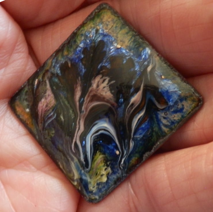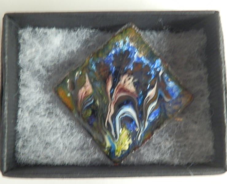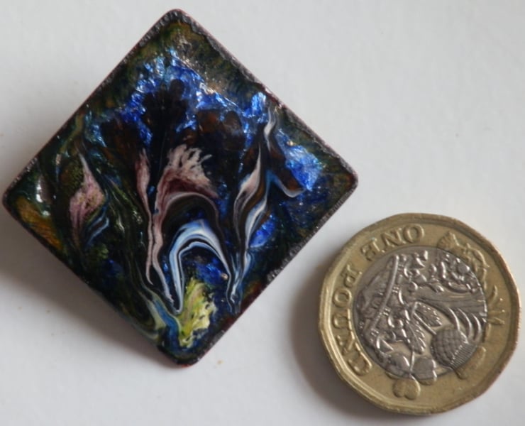 The base of the brooch is a 30mm square of copper. It is mounted on a 26mm brooch bar with a rotating safety catch, soldered to it.