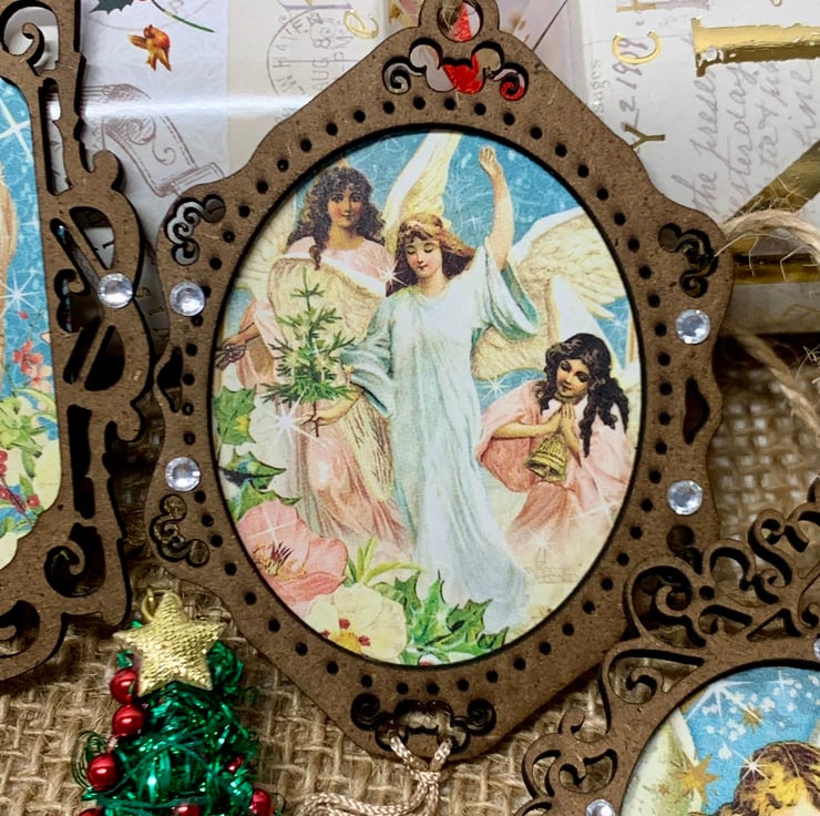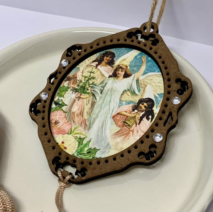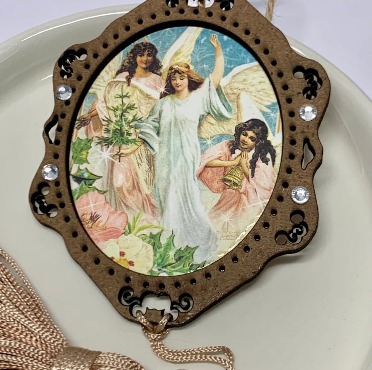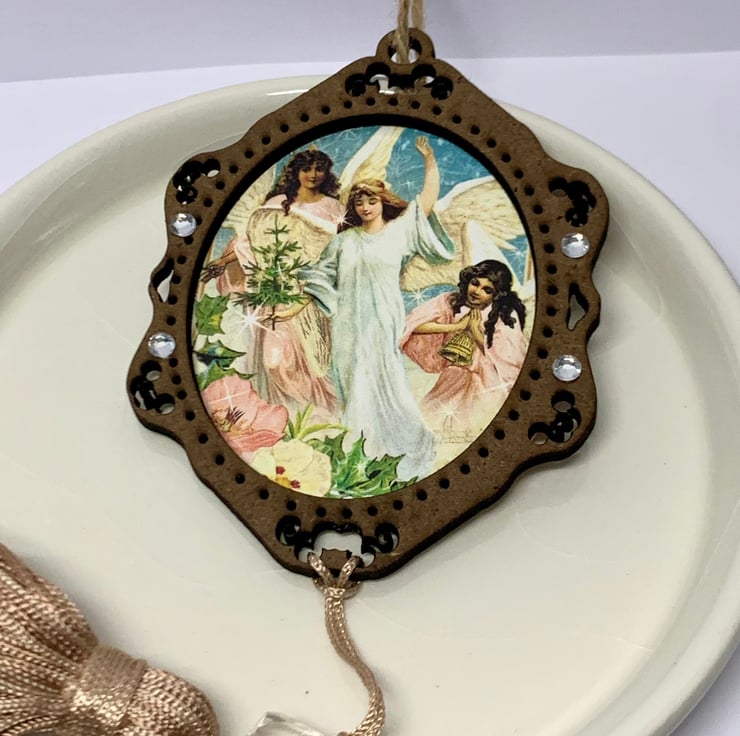 Do you or someone you know believe in Angels? If you do this Handmade One of a Kind hanging decoration depicting framed Angels would make a lovely gift for someone or a treat for yourself. I have given this beautiful piece a Vintage feel from the print I have chosen, to the frame and tassel. To keep that Vintage feel going I've added a handmade extra long tassel in a neutral colour with clear acrylic bead. To add a little sparkle I've used clear rhinestones to the frame. Comes ready to hang.