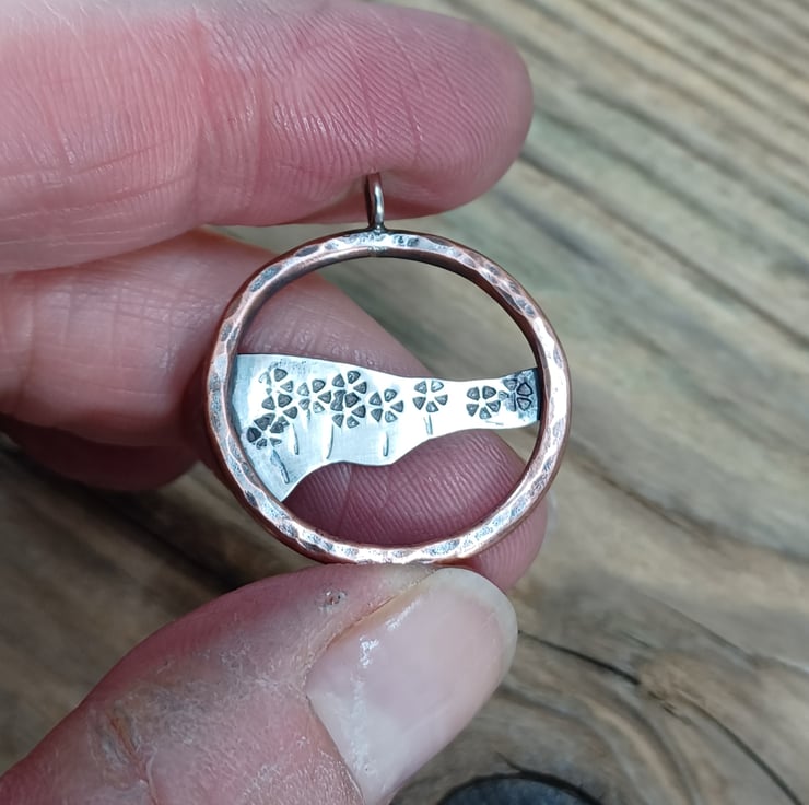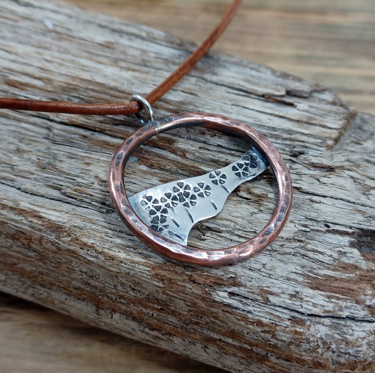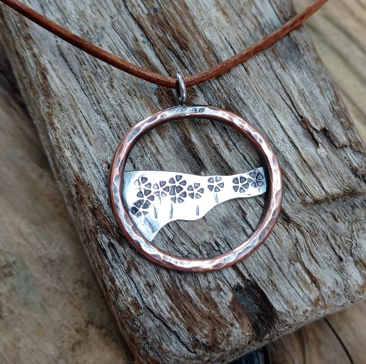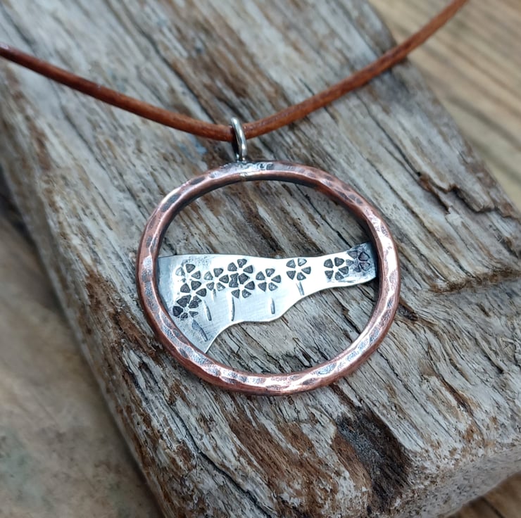 Made ftom copper wire and sterling silver sheet. The silver section has tiny little flowers stamped onto it , and the copper hoop has been given a dappled texture. Aged to pick out the detail and contrast of the two metals. Simply suspended on an adjustable vintage leather cord . Length 16- 18 " with lobster clasp closure.