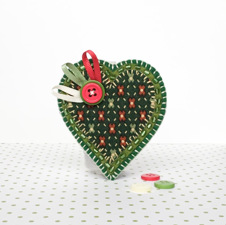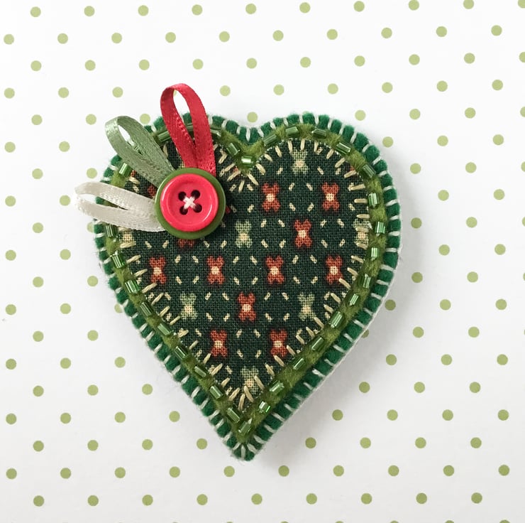 It features a hand stitched heart which has been mounted onto olive green felt and edged with coordinating shiny bugle beads. It has been backed onto dark green felt and is finished with a little button and ribbon detail.