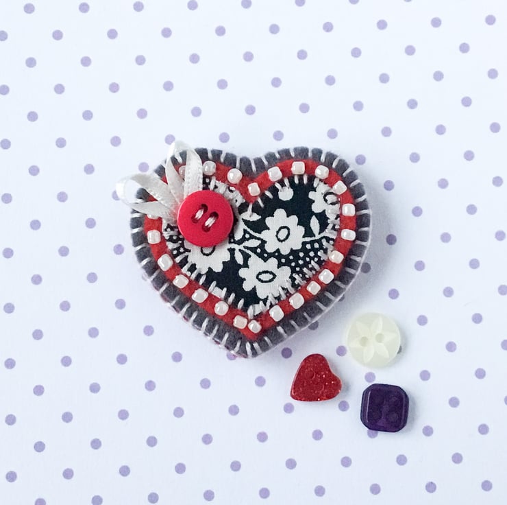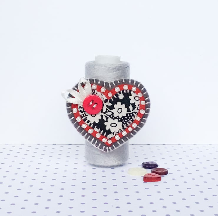 It features an appliqué heart in Liberty fabric which has been hand stitched onto red felt. This has been further mounted onto grey felt and is finished with beading, button and ribbon embellishments.