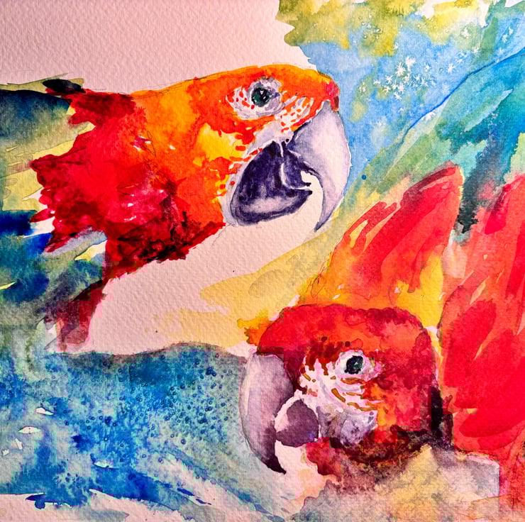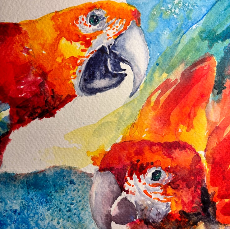 Two Macaws having a bit of a tiff. A lovely vibrant original watercolour on A4 watercolour paper, includes mount so it’s ready for your own frame!