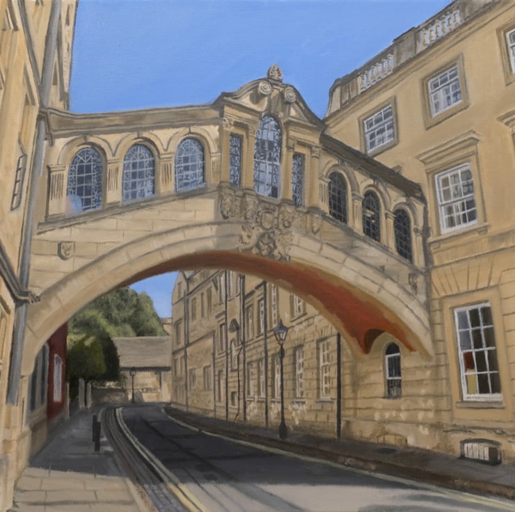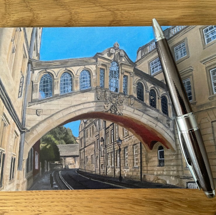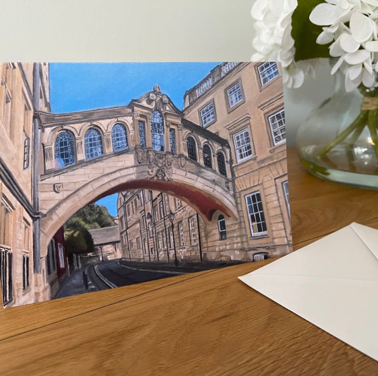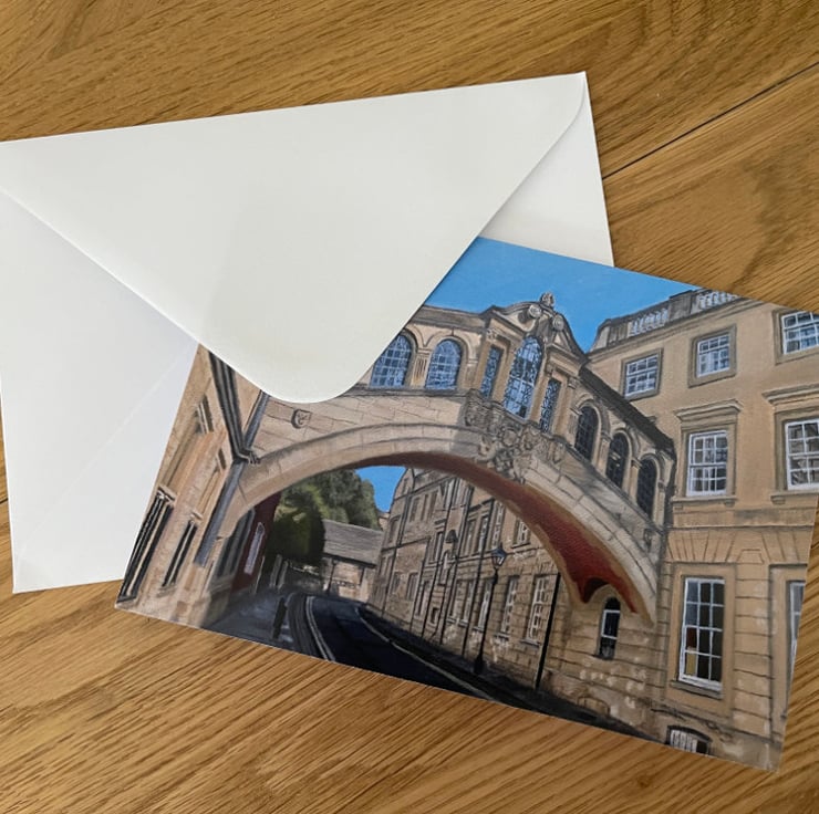 A high quality 7" x 5" greetings card of an original oil painting by me - blank inside. The Bridge of Sighs is a famous landmark in Oxford, and a popular subject for artists and photographers. Officially named Hertford Bridge, it spans new College Lane, and joins two parts of Hertford College. Designed by Sir Thomas Jackson and completed in 1914, its colloquial name comes from its similarity to the Bridge of Sighs in Venice.