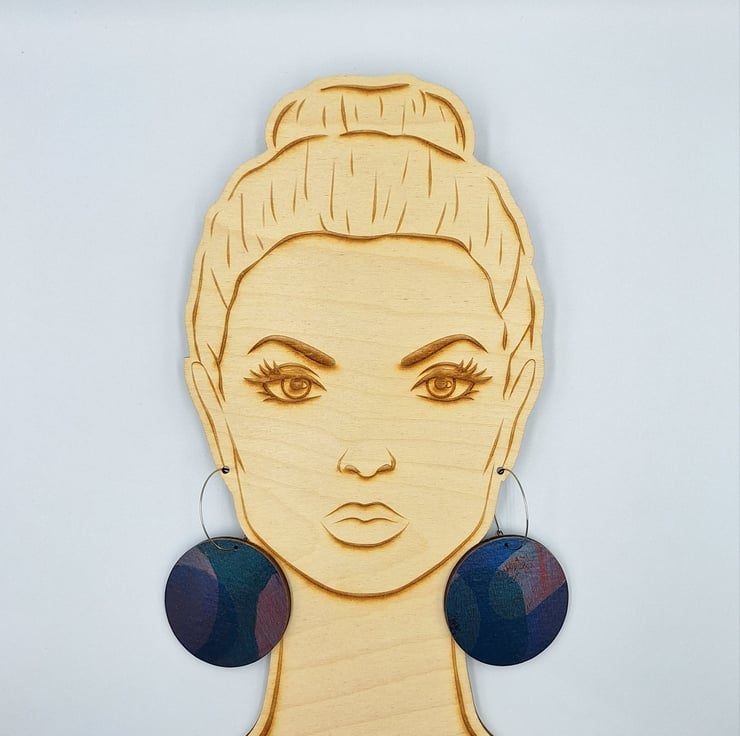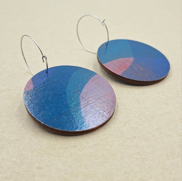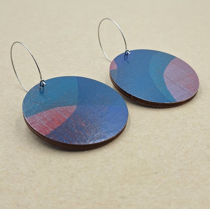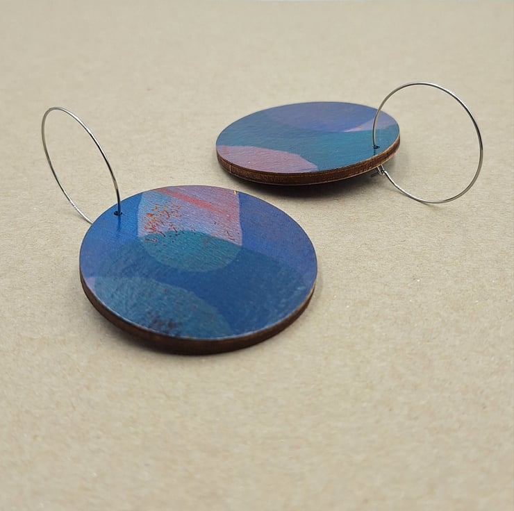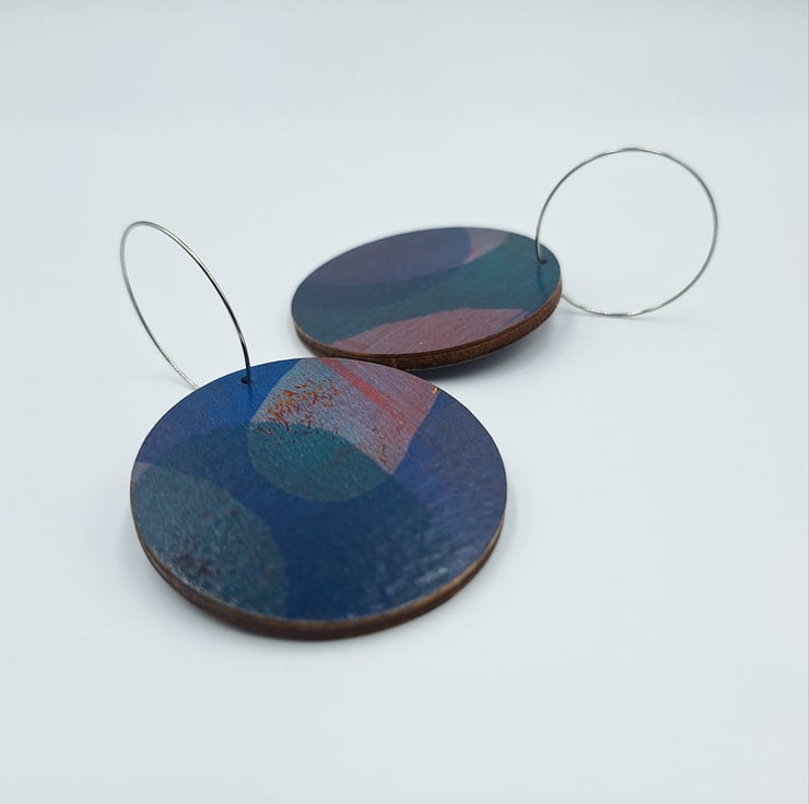 Big hooped dangly earrings with a hand printed abstract design in blues, burnt orange, greens and mauve purple.