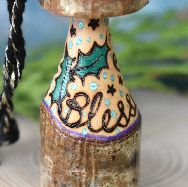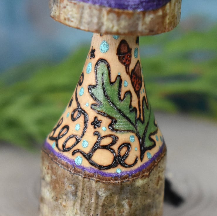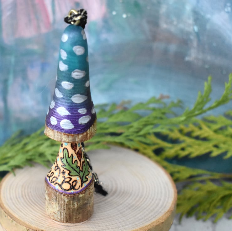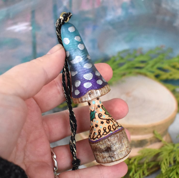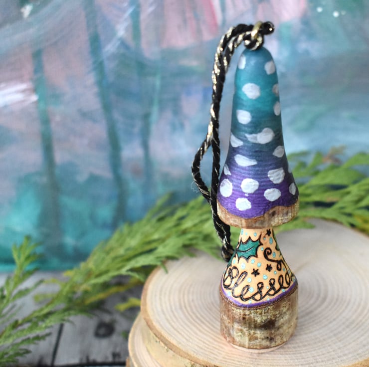 An unusual wood burned mushroom decoration for the home! This one has the words Blessed Be and some holly and oak leaves. Decorated with metallic paint, and art pencils.