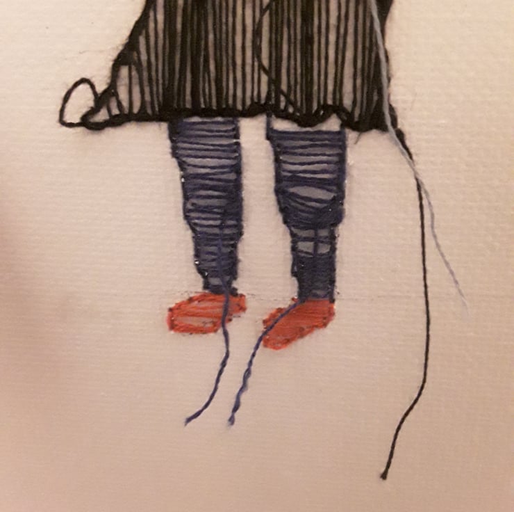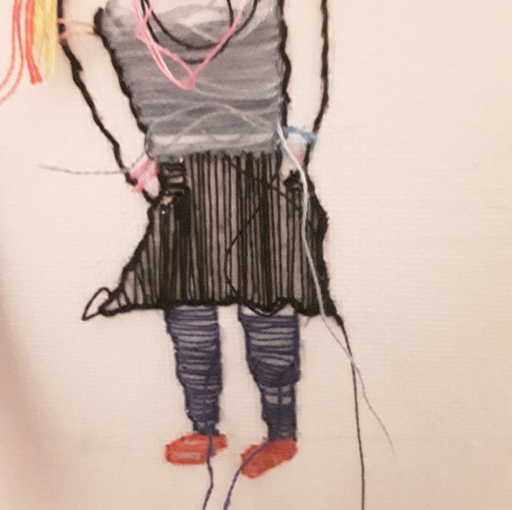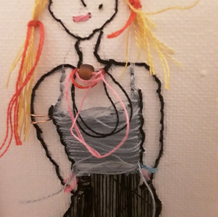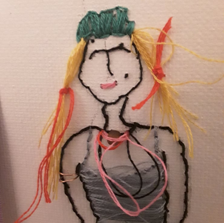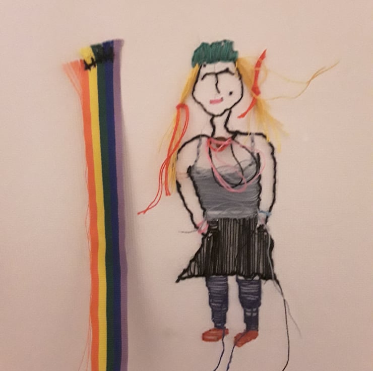 This piece features a small custom textile artwork that showcases a one-of-a-kind handmade design. It depicts a young woman with long hair styled in alternative fashion, excluding a strong sense of individuality. The artist employs a mix of loose stitches to achieve a relaxed and unconventional aesthetic, all set against a backdrop of a vintage, weathered pride symbol.