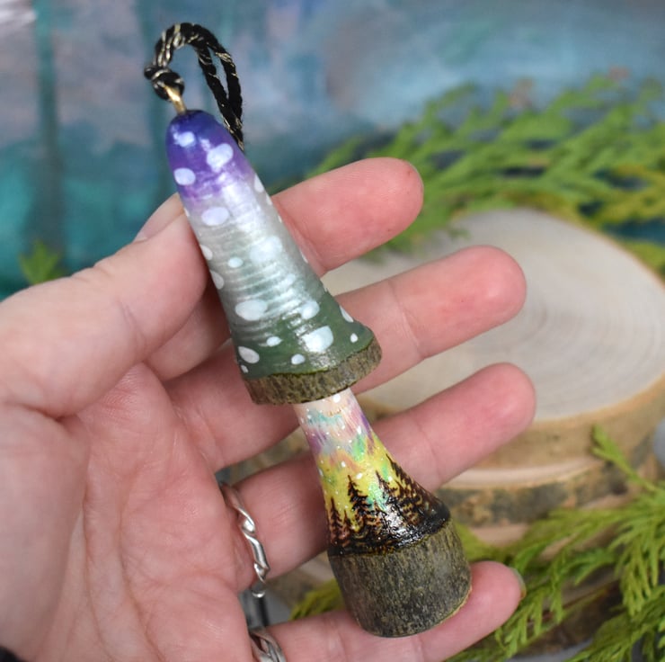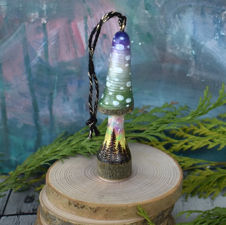 An unusual wood burned mushroom decoration for the home! This one has an aurora in the sky and some silhouetted trees. Decorated with metallic paint, and art pencils.