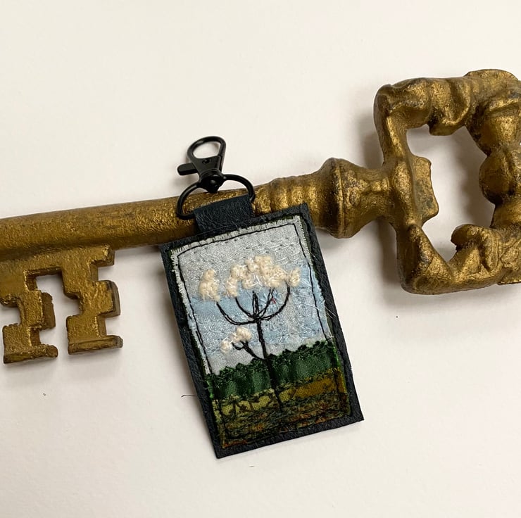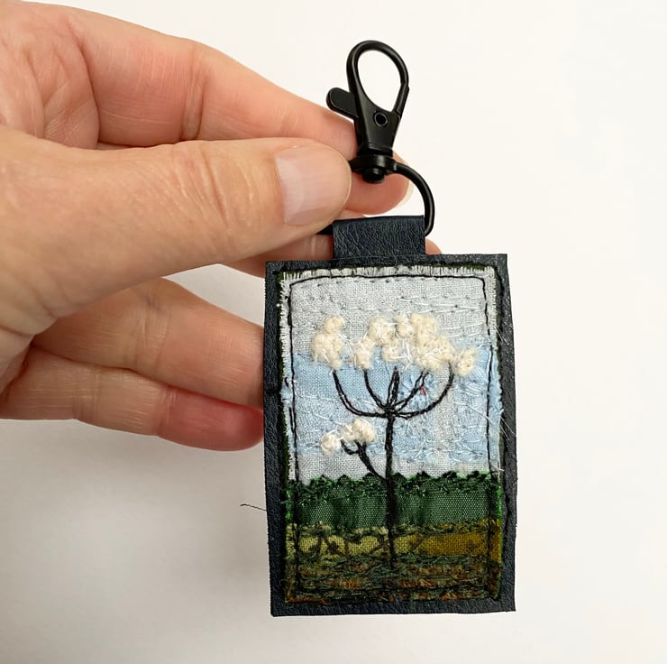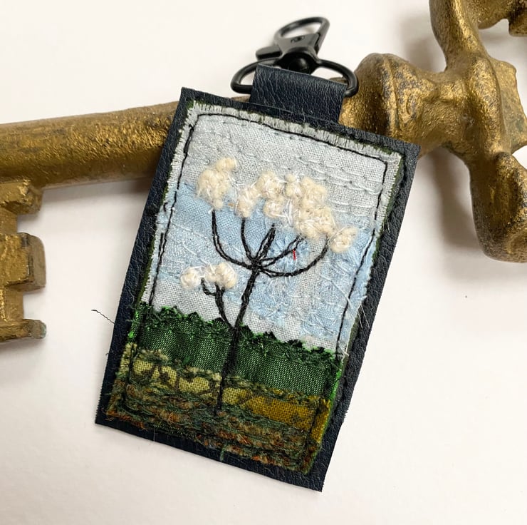 This charming up-cycled meadow sweet or cow parsley keyring is made with up-cycled fabric. It’s plain in the back. It measures 4.5 x 7.5cm. With the split ring and lobster clasp the length is 11cm.