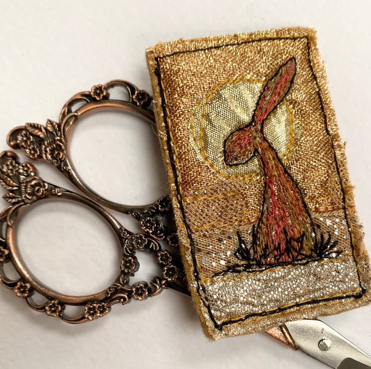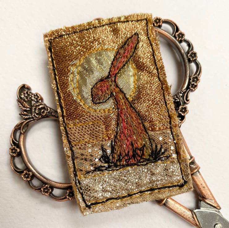This adorable handmade free motion embroidered harvest sunset hare brooch is made from up-cycled pre felt. It is felt backed, and has a brooch pin with hook on the reverse to keep it nice and secure. It measures 6 x 3.6cm approx.