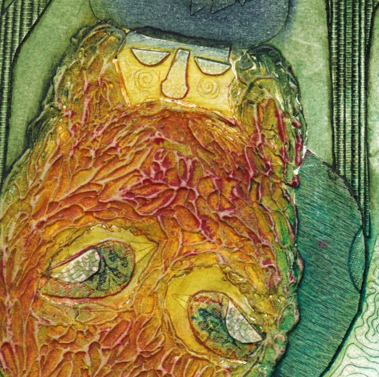 This is a highly textured collagraph print where I used lots of fabrics and glues onto a board then coated the printing plate with shelac. The ink was rubbed into the plate and then rolled under the press onto damp paper.