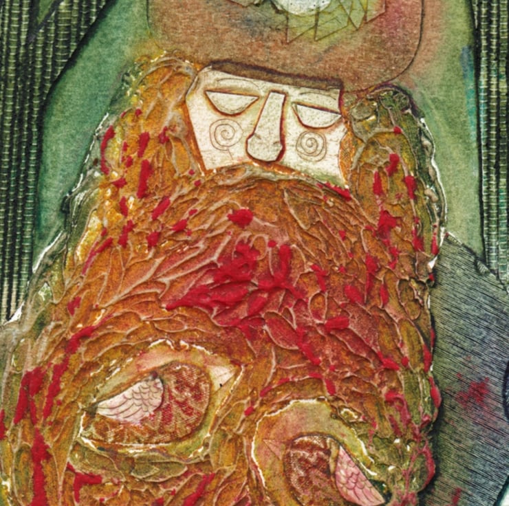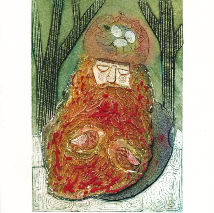 This is a highly textured collagraph print where I used lots of fabrics and glues onto a board then coated the printing plate with shelac. The ink was rubbed into the plate and then rolled under the press onto damp paper.