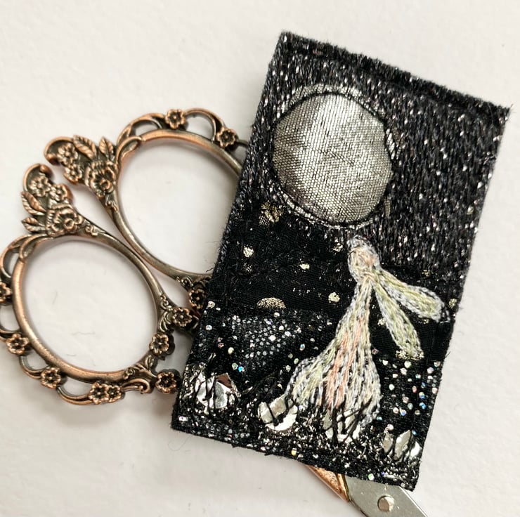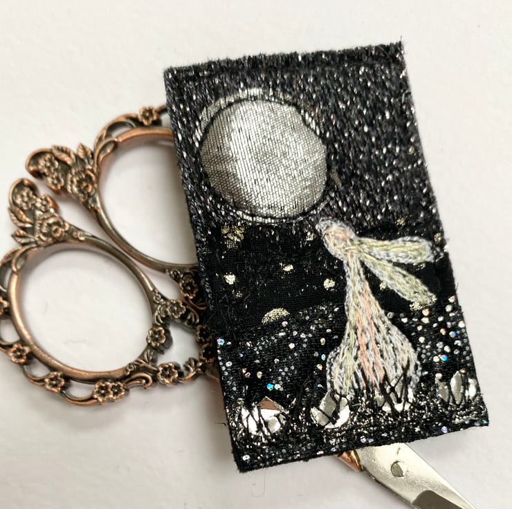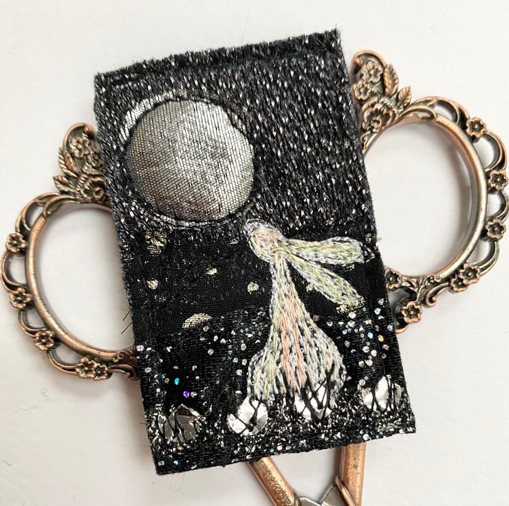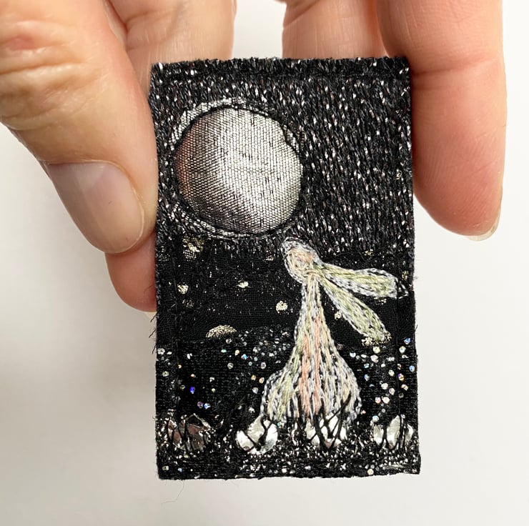 This adorable handmade free motion embroidered full moon gazing hare brooch is made from up-cycled pre felt. It is felt backed, and has a brooch pin with hook on the reverse to keep it nice and secure. It measures 6 x 4cm approx.