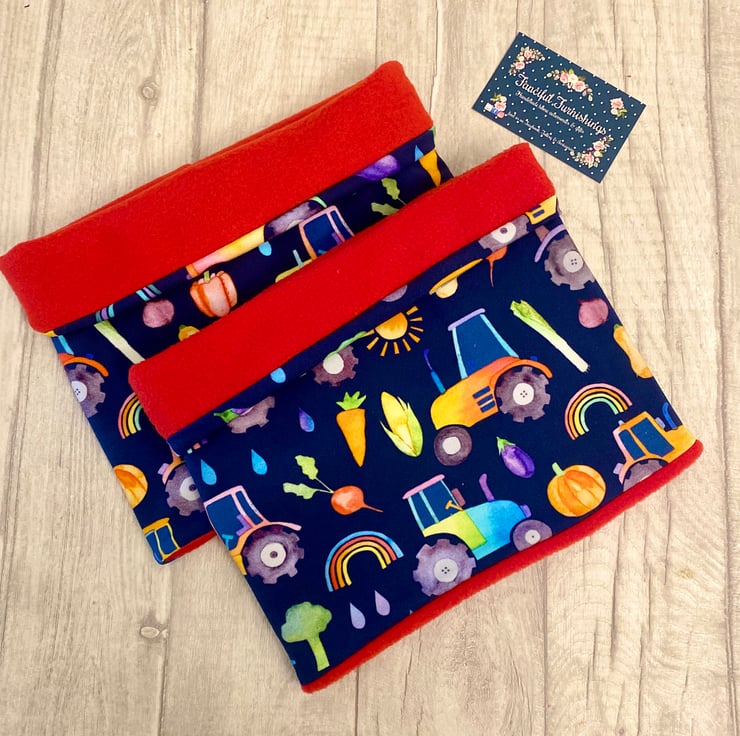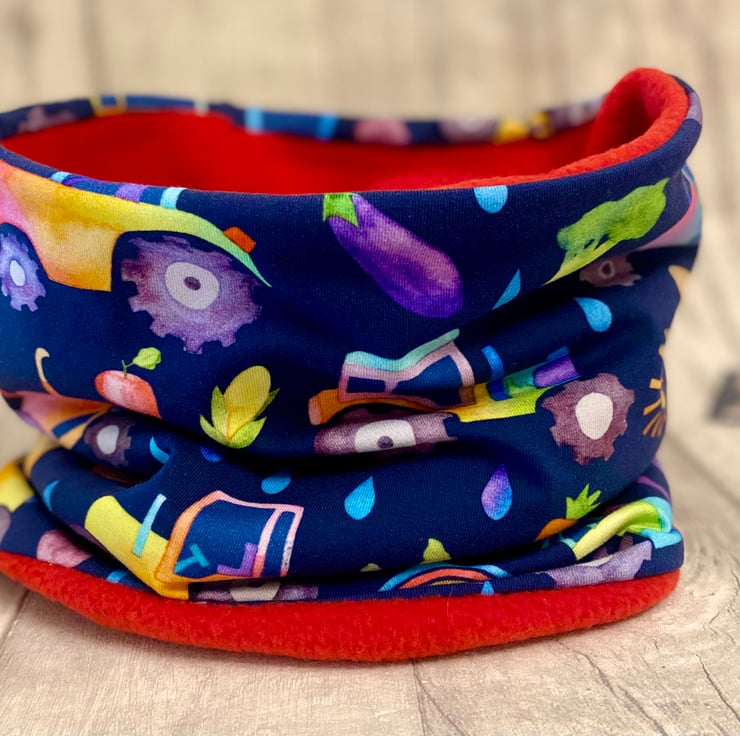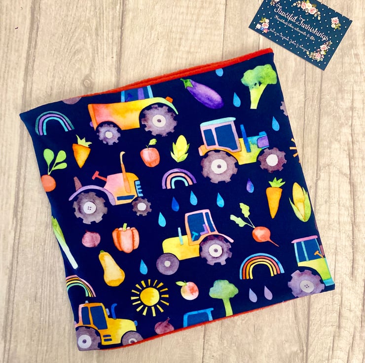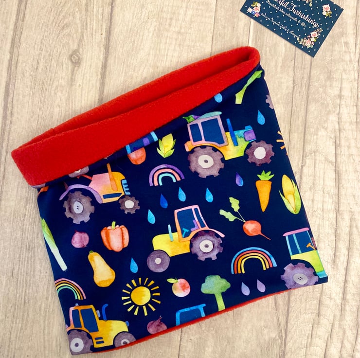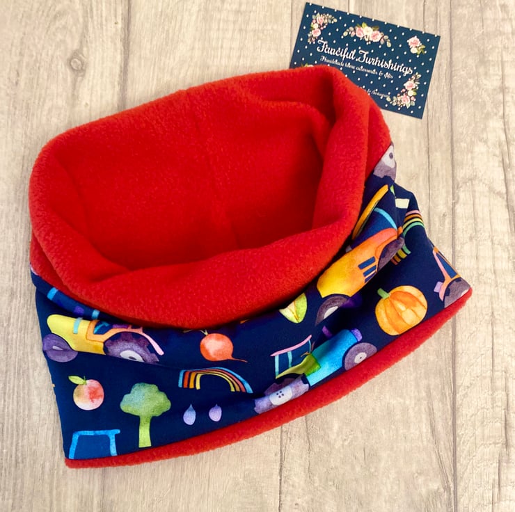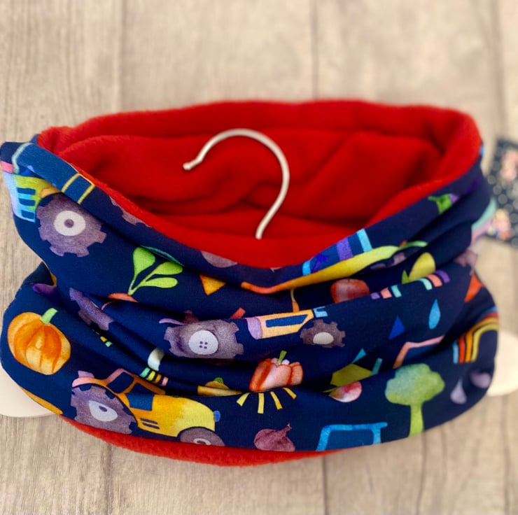 Child’s cozy snood neck warmer. This cute child sized snood neck warmer has been created with beautiful cotton jersey fabric with a gorgeous tractor farm themed print on a navy background. I’ve lined it with a bold red anti pil fleece fabric.