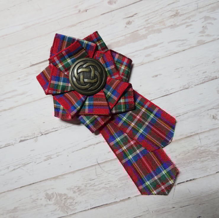 Made with a small circle of red felt with a small brooch pin attached and a handmade and sewn ruffle of Royal Stewart tartan ribbon with wide ribbon shaped trails and finished with a large dull Brass Celtic button.
