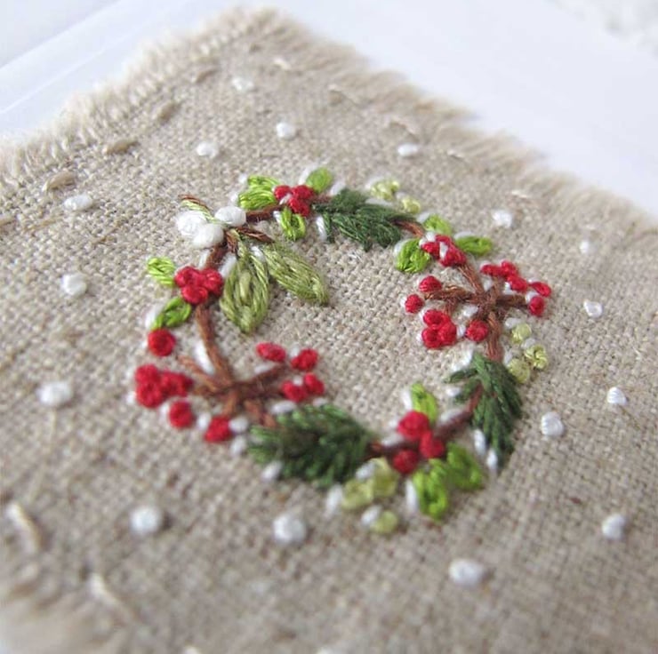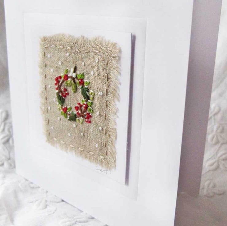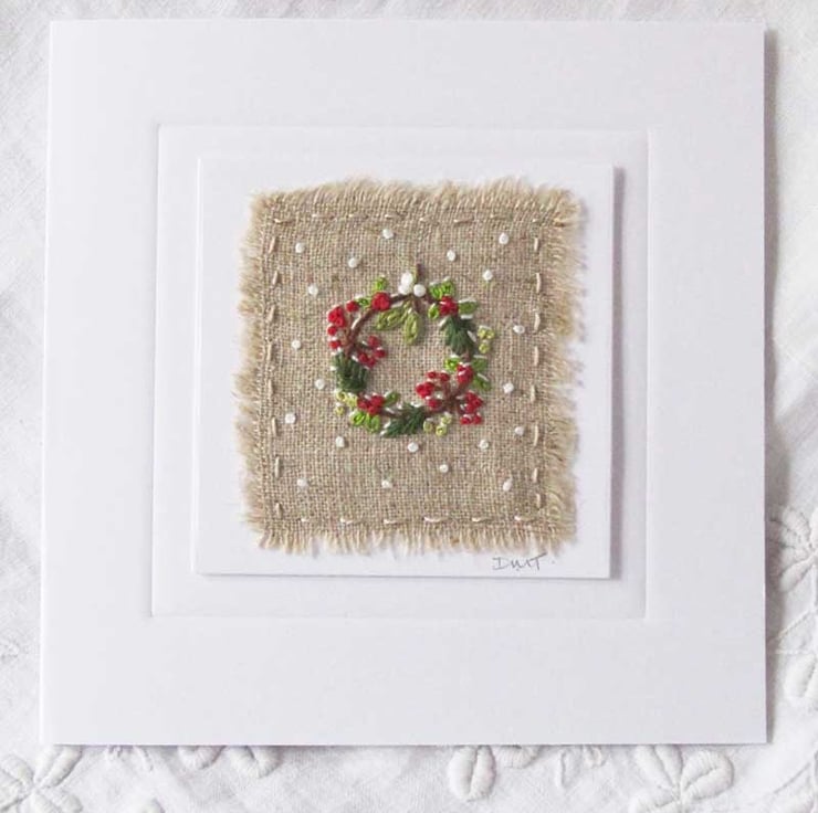 This beautiful card has been embroidered by hand onto a natural linen background. The design is a circlular wreath of berries, foliage, and a sprig of mistletoe. A dusting of white snow has been embroidered onto the foliage and random snow is dotted around the outside of the wreath - a perfect card for a special person. It has been mounted on a card base and is surrounded by an embossed square. The card has been left blank for your own message.