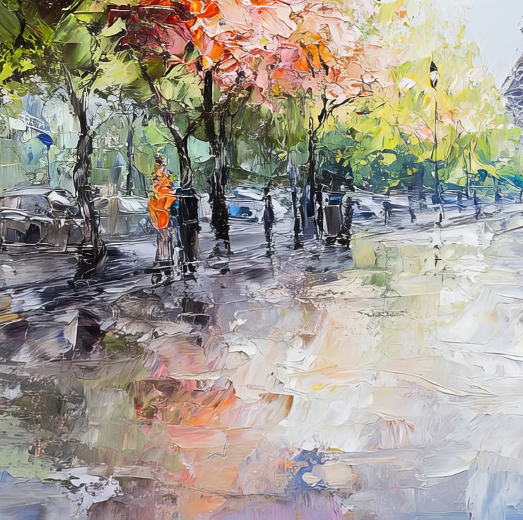 Capture the charm and romance of Paris with this 5"x7" print, featuring a scenic rainy day stroll by the iconic Eiffel Tower. This impressionistic artwork beautifully portrays a Parisian street scene, complete with lush trees, colorful umbrellas, and reflections on wet cobblestones, evoking the elegance and serenity of a spring day in the City of Light.