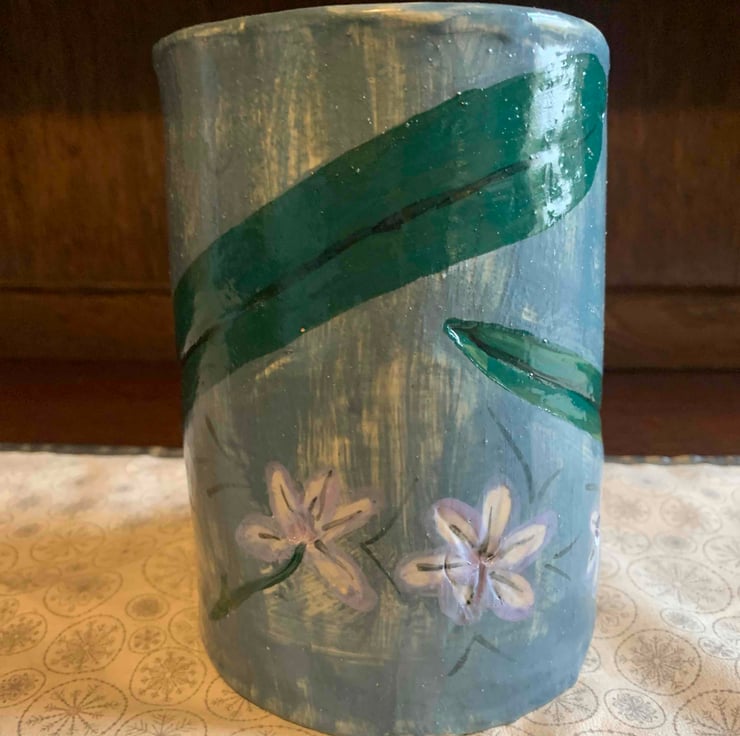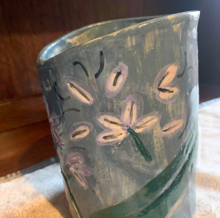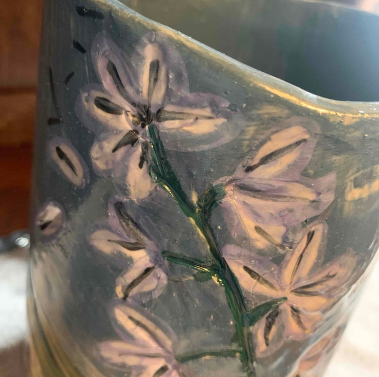 This beautiful vase has been handbuilt using the slabbing technique …… it has been made with white clay and bluebells and leaves have been pressed into the clay to give it the design.