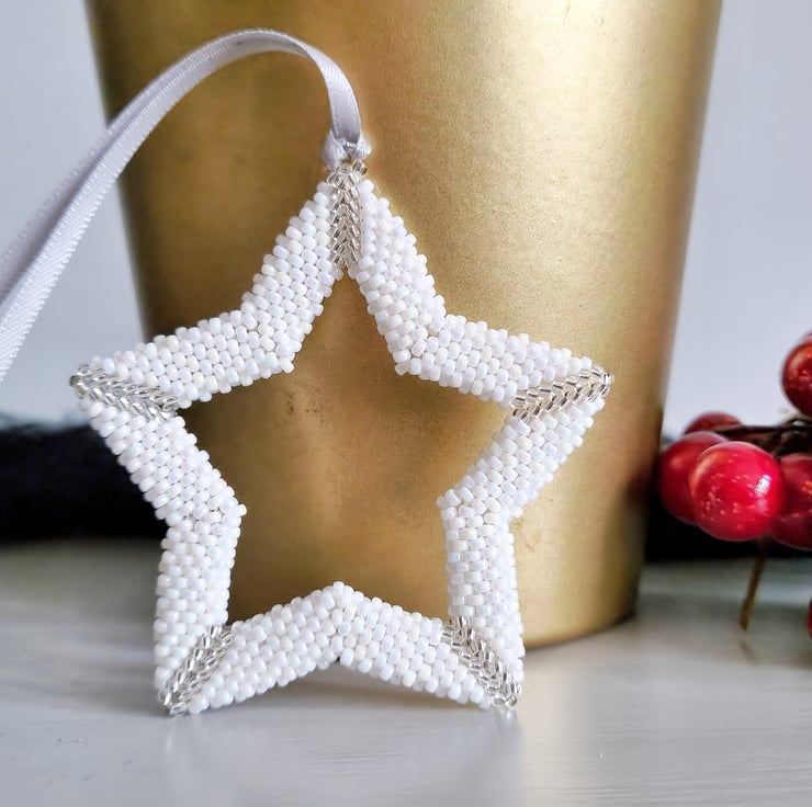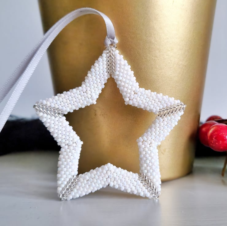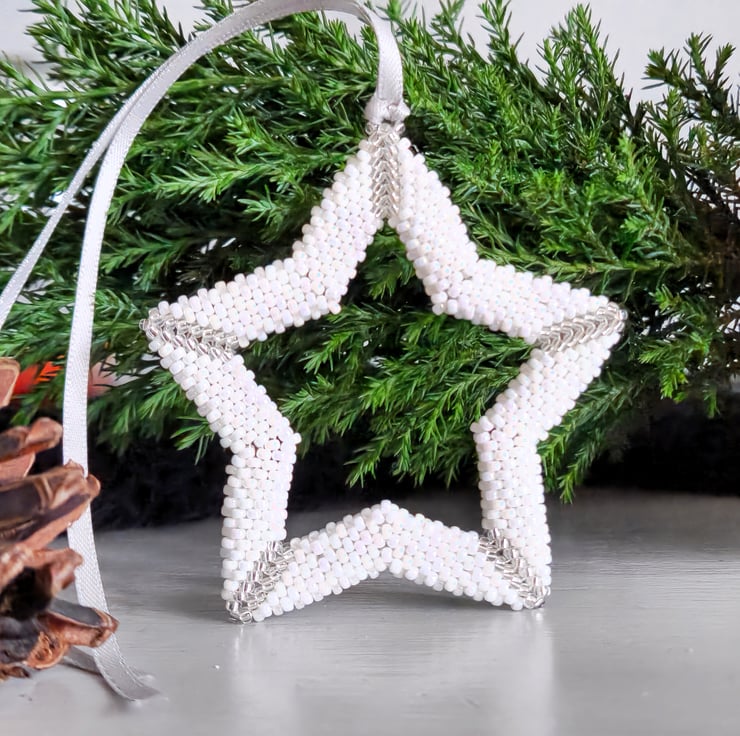 Measuring just over 7 cm, this unique beaded decoration is perfect for decorating your tree, however, is also sizeable enough to be hung as a standalone decoration. Each Christmas star hanging ornament is peyote woven using strong, waxed nylon thread and finished with a generous length of colour co-ordinating silver ribbon.