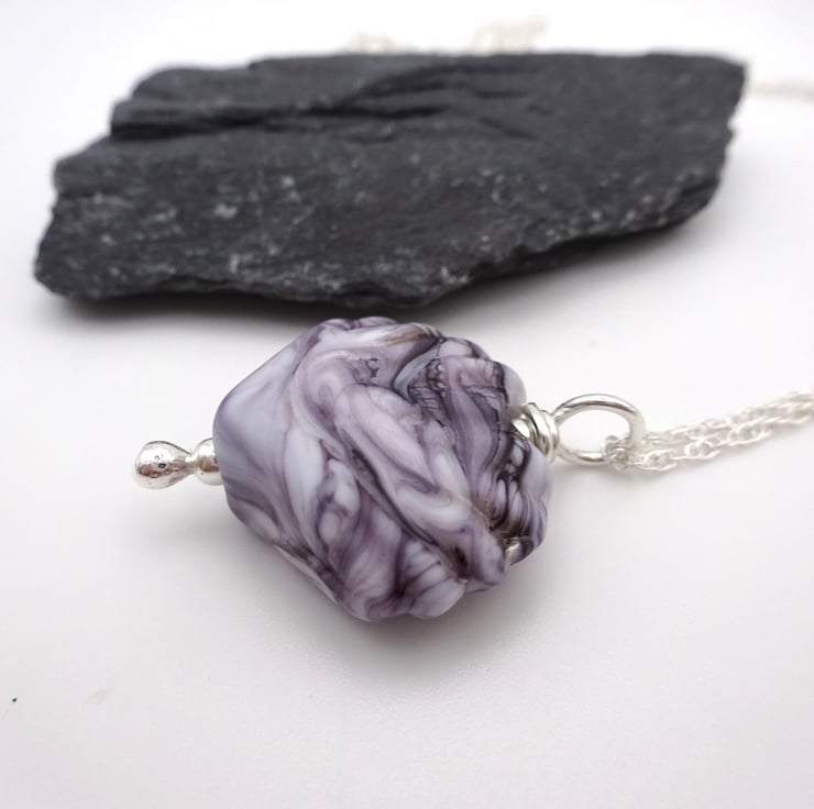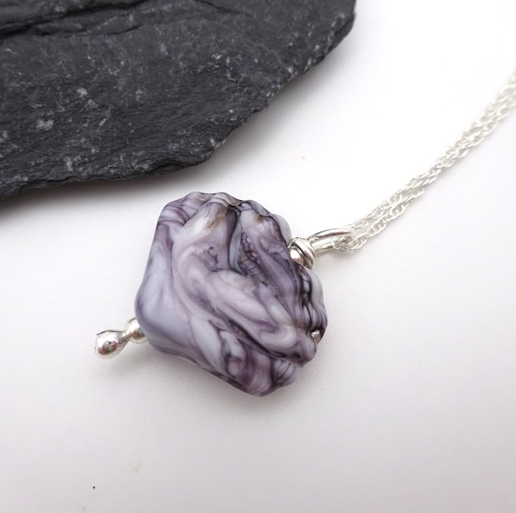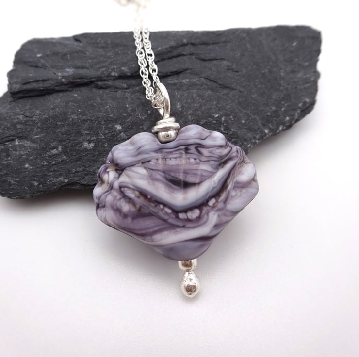 It features a sterling silver chain strung with a handmade lampwork glass purple sea shell pendant.