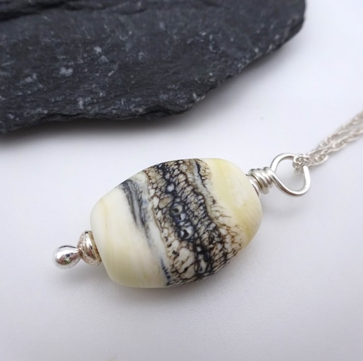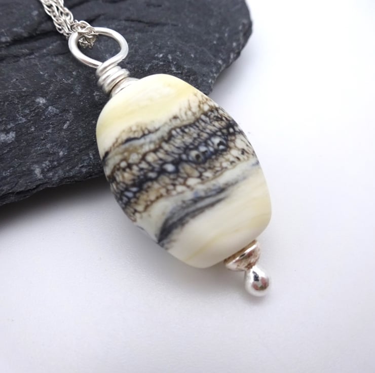 A sterling silver chain featuring a handmade lampwork glass pendant.
