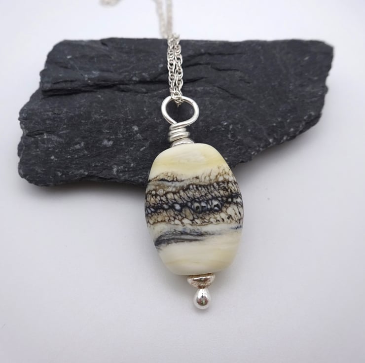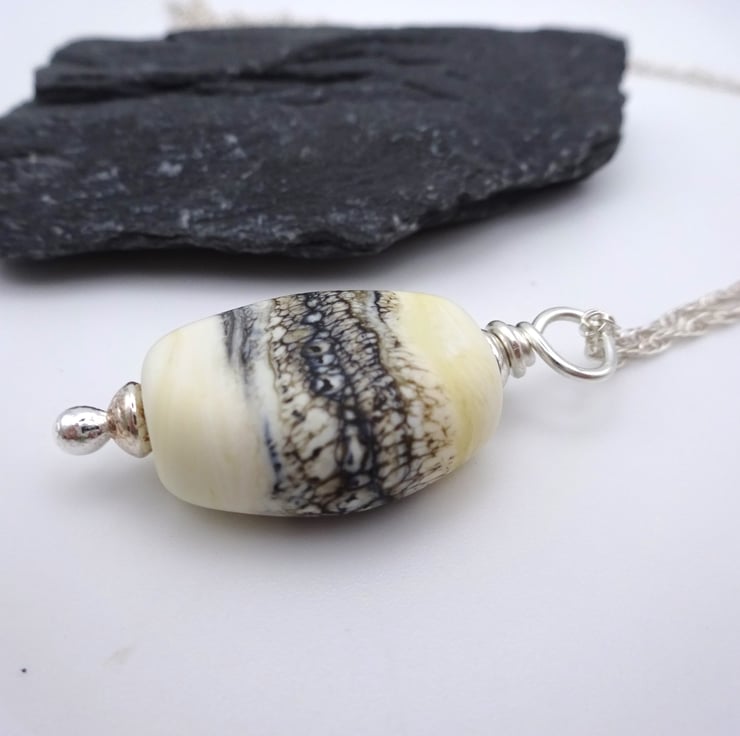 The pendant has been made with ivory and black glass, it has been tumbled for a smooth finish and hand shaped.
