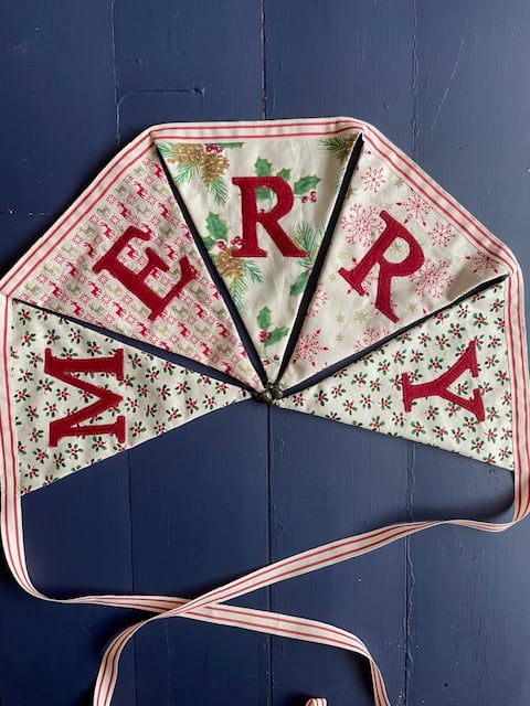 Bring a touch of fluttery cheer to your Christmas festivities with this jolly ‘MERRY CHRISTMAS’ bunting in shades of cream, red and green with a tiny touch of gold. The perfect antidote to plastic decorations, this bunting can be brought out for many Christmasses to come!