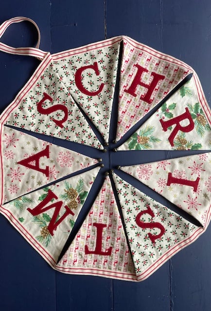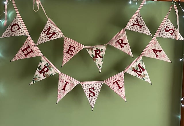 The words ‘Merry Christmas’ have been hand cut from red felt and then machine stitched in place. The flags have been sewn onto co-ordinating red and cream tea towel striped ribbon and each flag has a tiny brass bell hand-stitched onto each point. Not just decorative, they really do gently jingle!