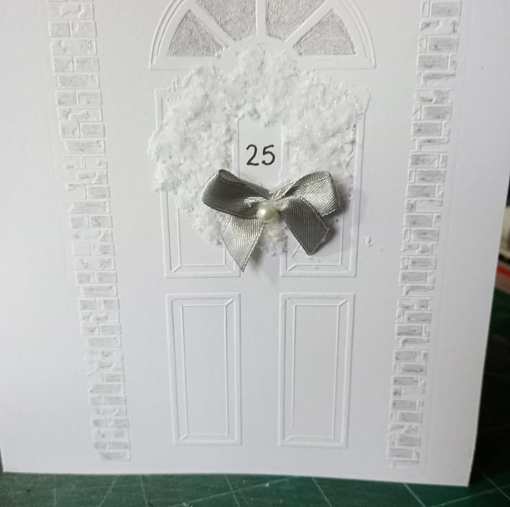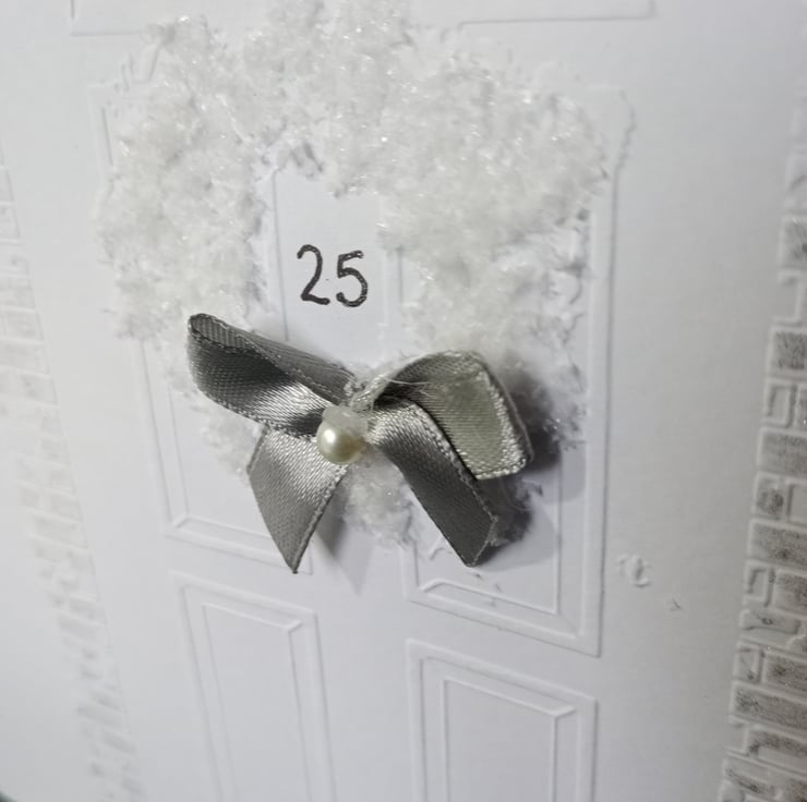 Completely handmade and uniquely designed a pack of 4 same design Christmas cards. Consisting of a beautiful front door embossed onto quality pristine white card. Hand coloured. Embellished with white fairy soft and a grey ribbon bow