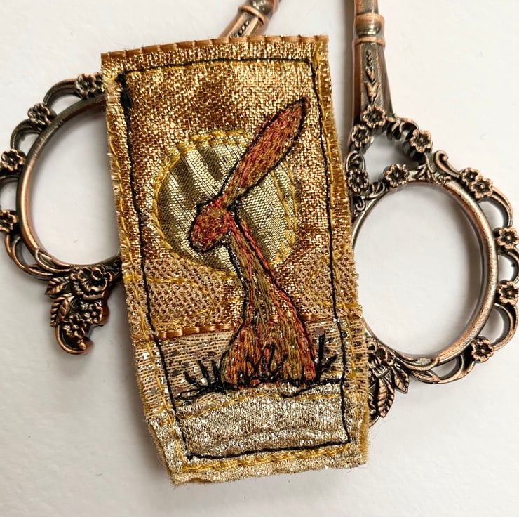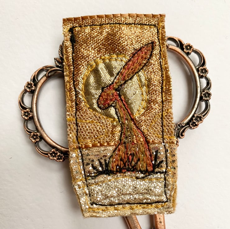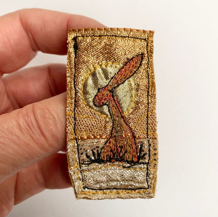 This adorable handmade free motion embroidered harvest sunset hare brooch is made from up-cycled pre felt. It is felt backed, and has a brooch pin with hook on the reverse to keep it nice and secure. It measures 6 x 3cm approx.