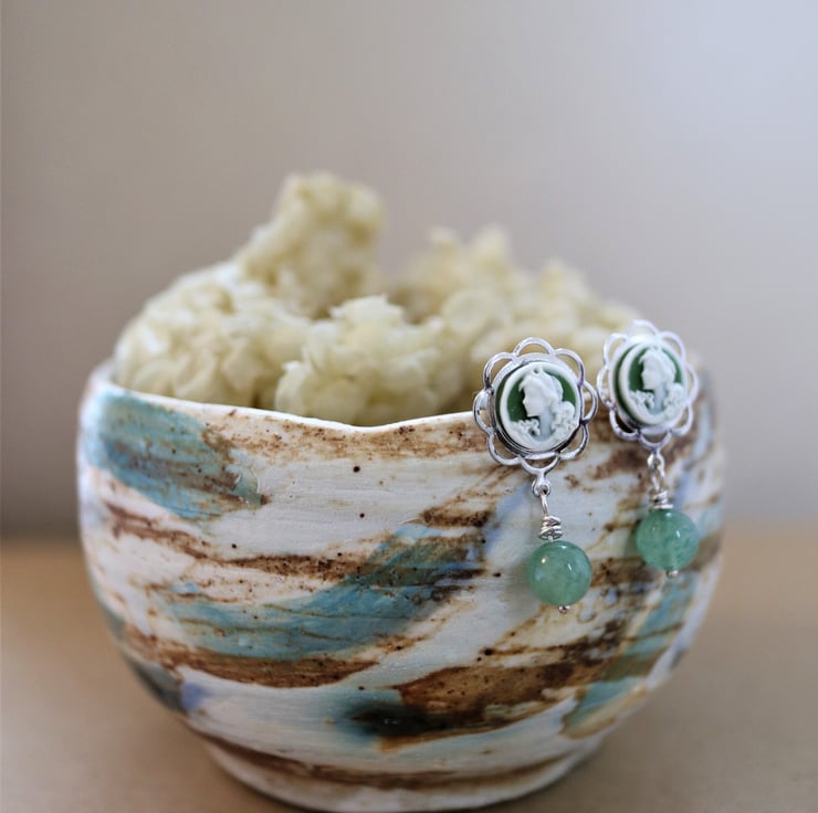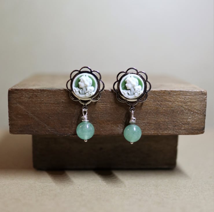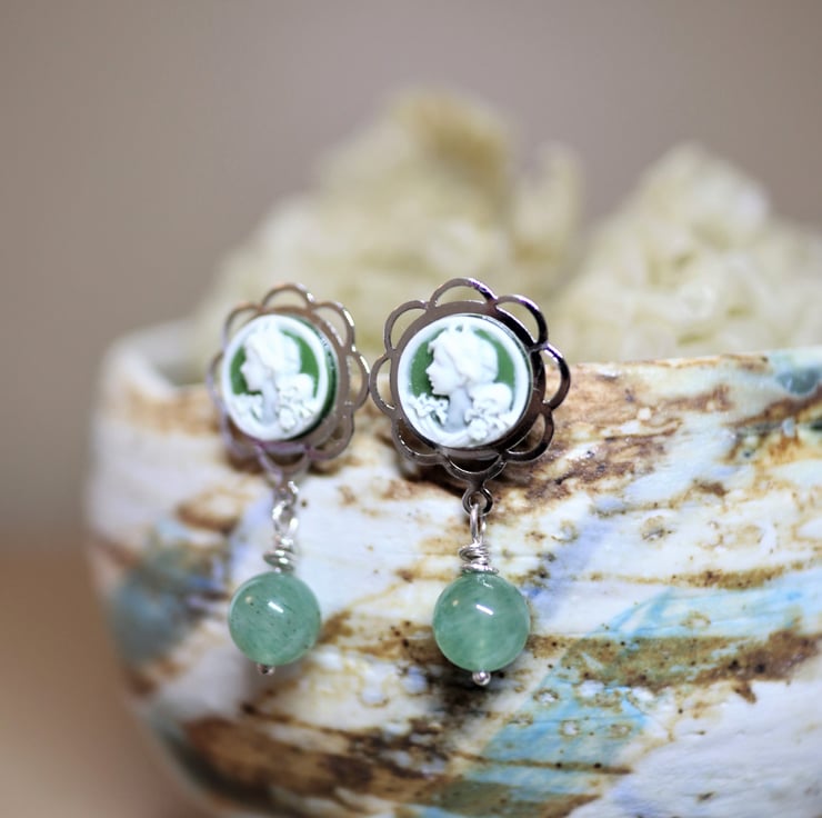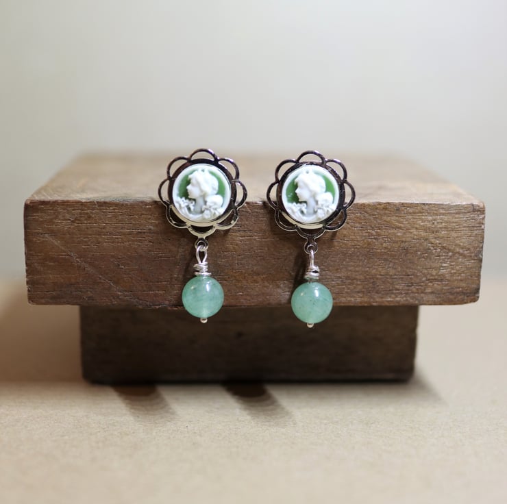 Mini cameo earrings featured with aventurine Gemstone - 925 silver findings