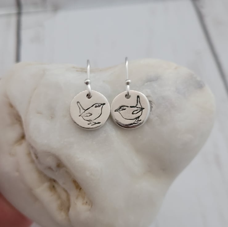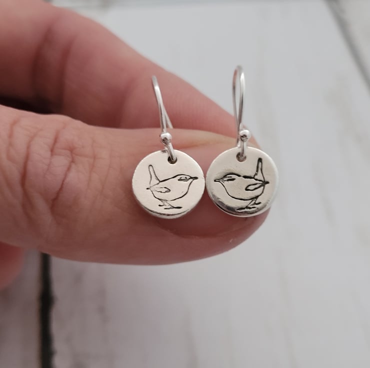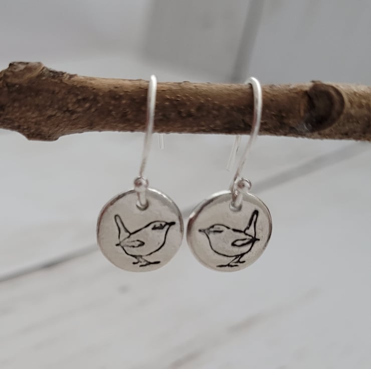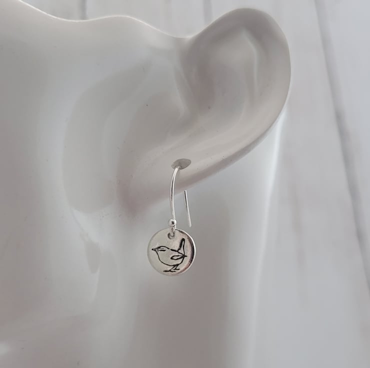 Pretty dangle sterling Silver wren bird earrings featuring my unique wren design on round charm dangle style earrings.