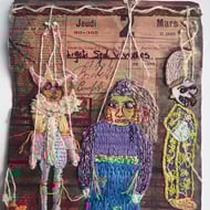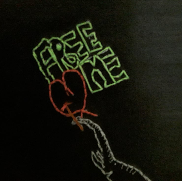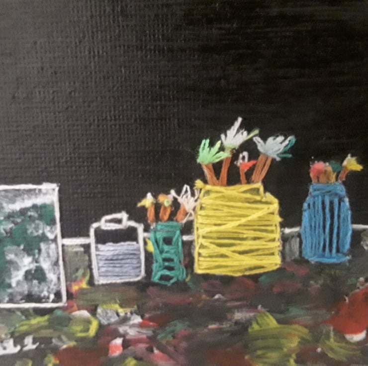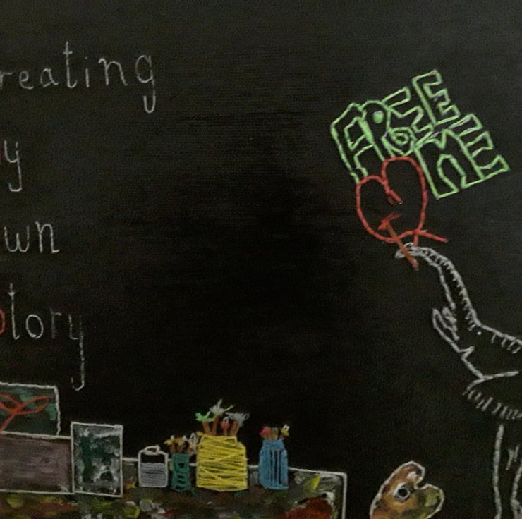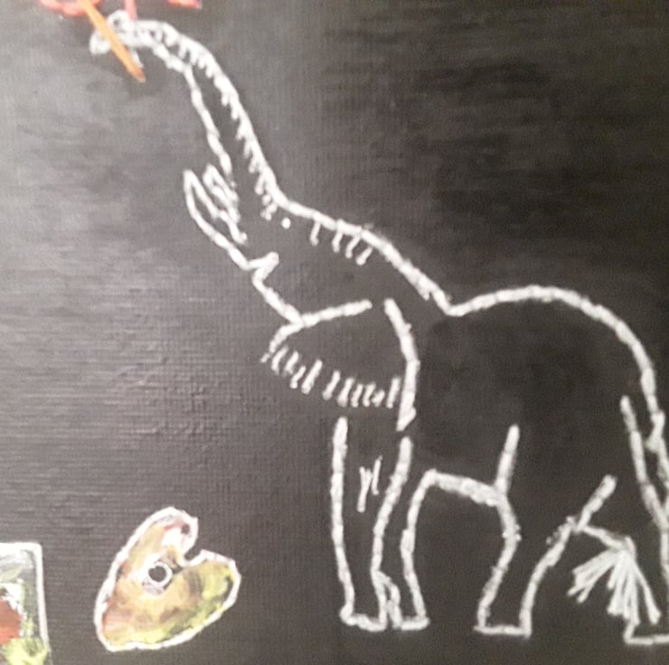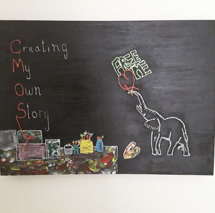 A canvas artwork that beautifully combines various media, primarily painting and needlework. The phrase " Creating my own story" is inscribed on the canvas, accompanied by an adorable elephant that is writing" free me " alongside a heart. Below, an artist pallette and a table cluttered with paint splatters and jars filled with paintbrushes add to the scene. Set against a black backdrop, this piece is sure to infuse warmth into any home.