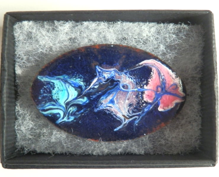 After building a base of several coats of clear enamel I added the midnight blue. After firing that I added patches of transparent pink, amethyst and sky blue over a white base and drew through the colours with a steel point to make the random pattern that you see.