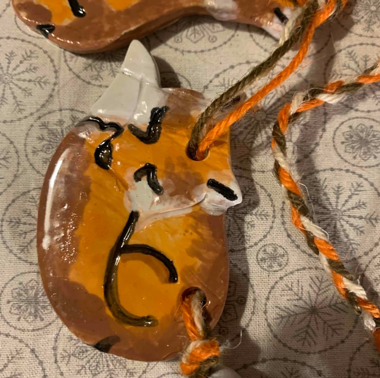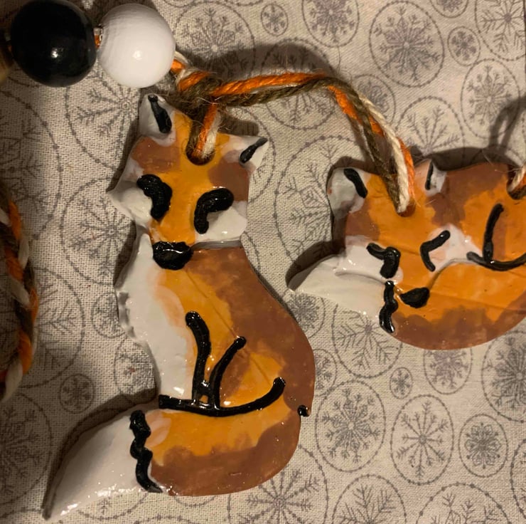 They are threaded with orange, white and brown twine and a gold, white and black wooden bead to finish and in total there are 8 foxes.