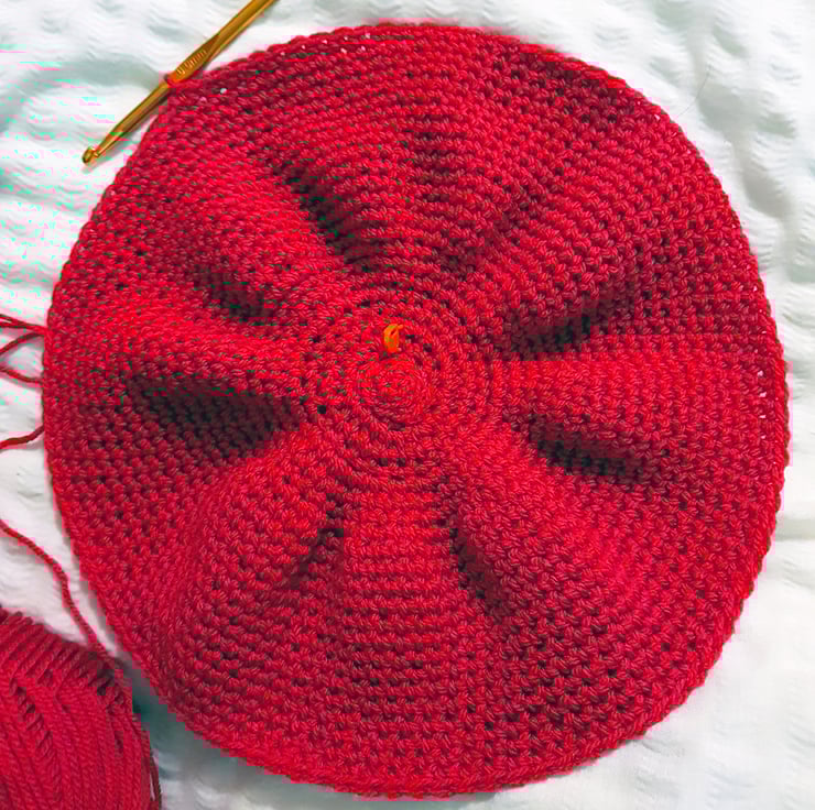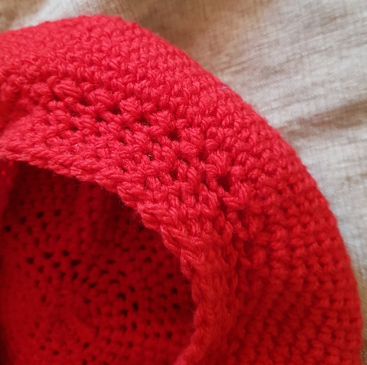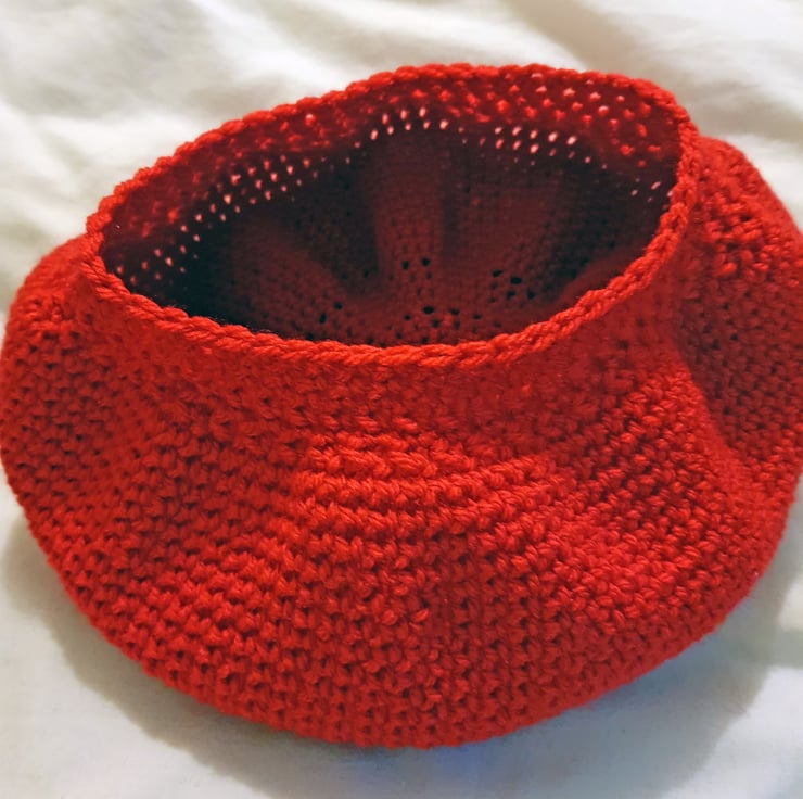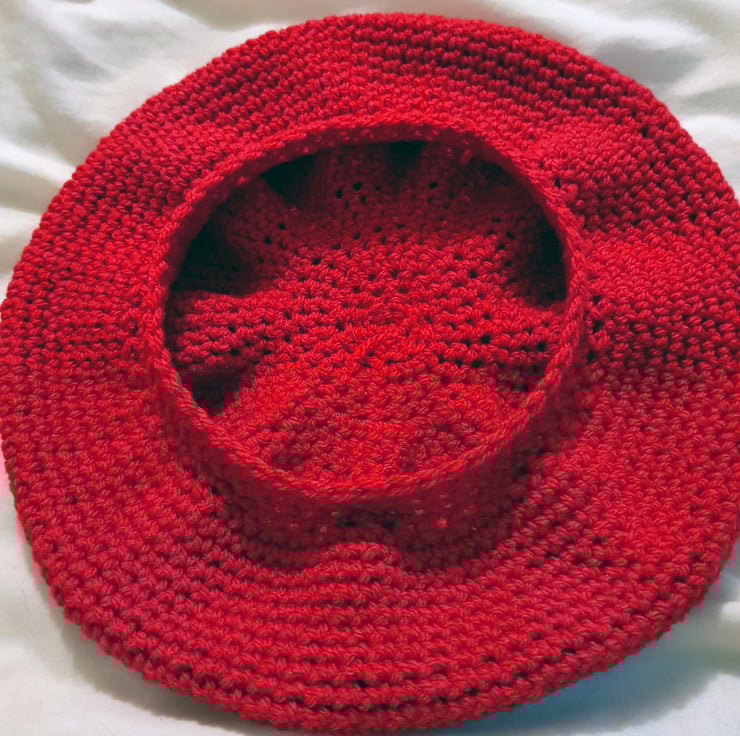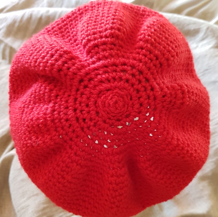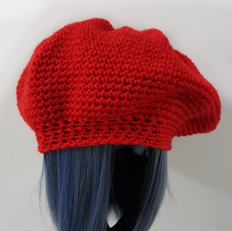 Hand made crochet hat. Double knit, 70% Acrylic and 30% wool. I never use patterns or repeat, making each piece an original. No two of my hats are the same. Can be worn as a side hat Tam O Shanter style or as a beanie. All hats have my Flea Laney tag. The colour is a vivid red, variations can be seen in the photos due to the light in which the images were taken.