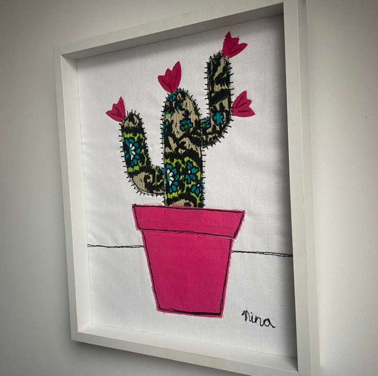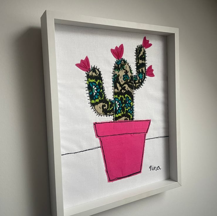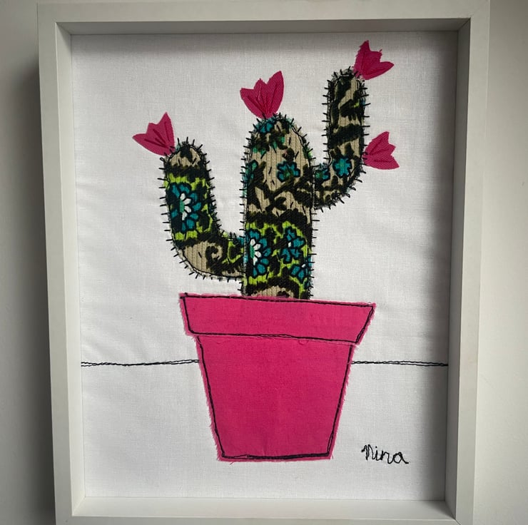 Cactus picture made by myself with machine embroidery and hand embroidery. I used cotton fabric and cotton embroidery thread. In wooden frame with glass front and hook at the back for hanging on a wall.