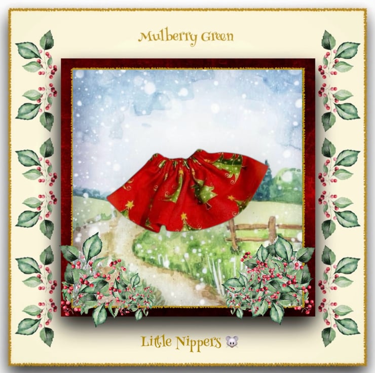 A little red and green skirt in a Christmas tree print, made specially to fit the Little Nippers.
