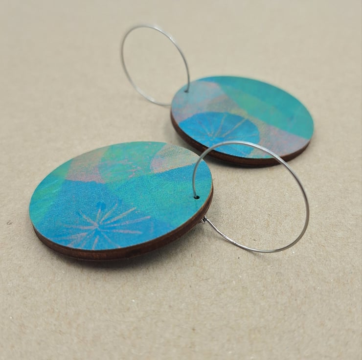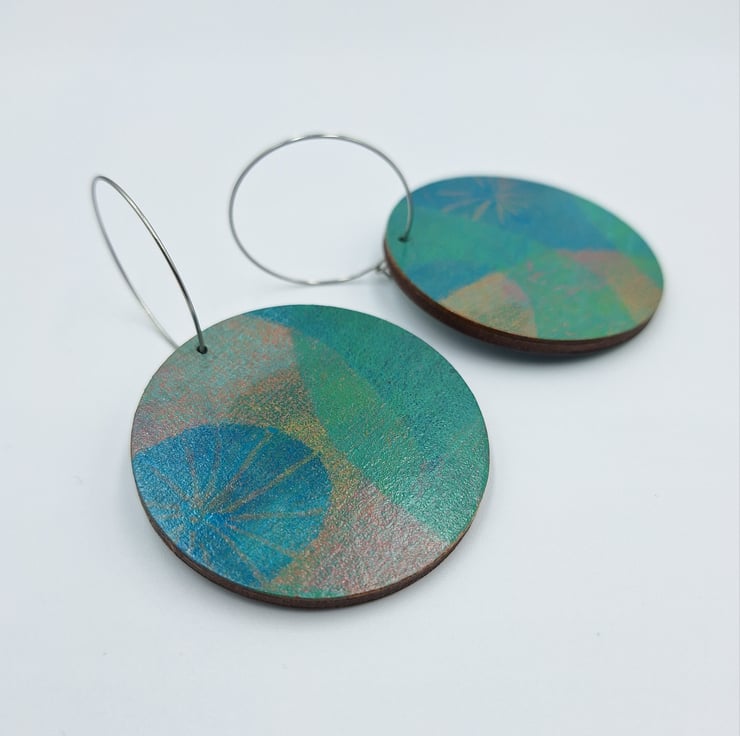 Green, blue and mauve abstract printed dangly earrings, lovely for both day and evening wear.