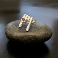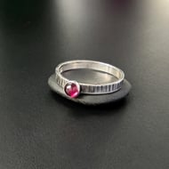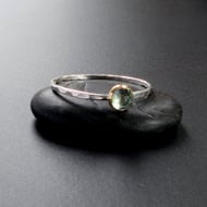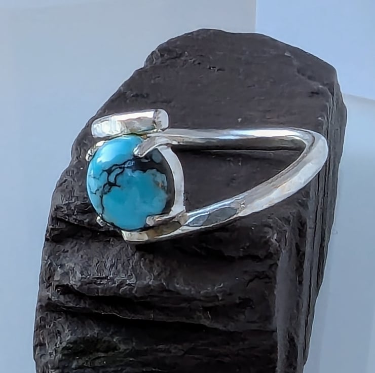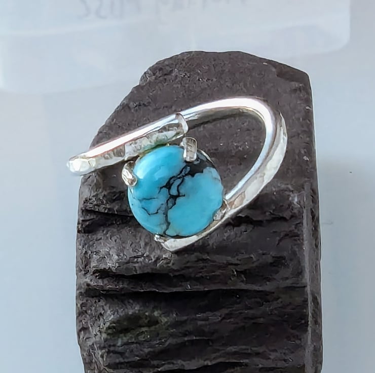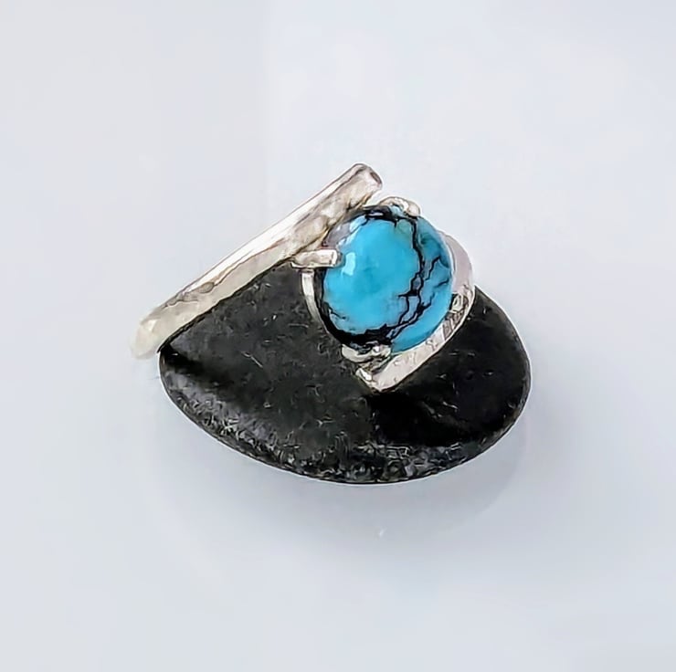 2 mm wide and hammered dimple textured ring set with a 8 mm matrix turquoise in a 4 claw setting.