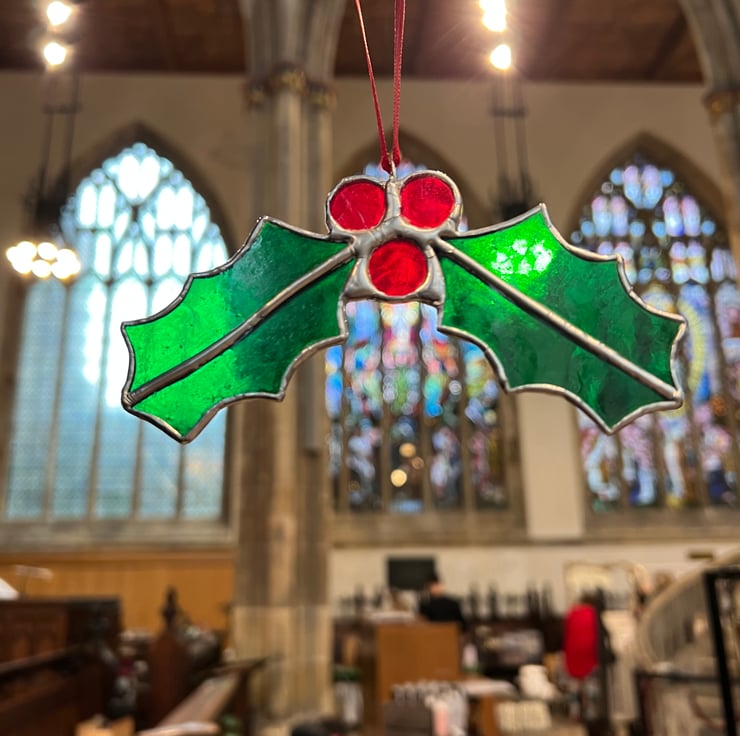 Stunning iridescent green stained glass holly and berries Christmas decoration with vibrant red berries. There is an option of silver or copper patina to personalise your choice. Rich and luxurious, these are stunning gifts but you might just love them too much to give away!